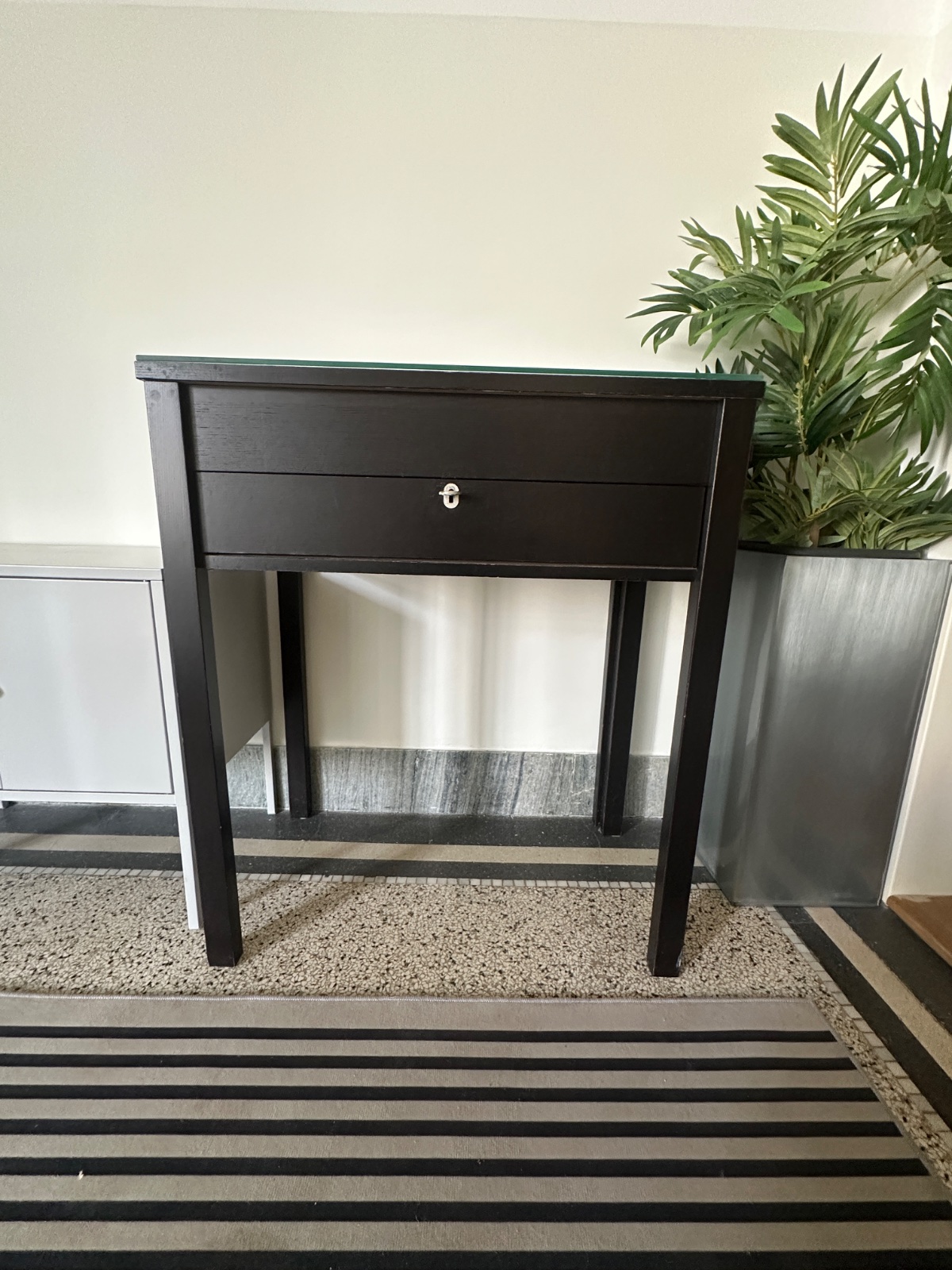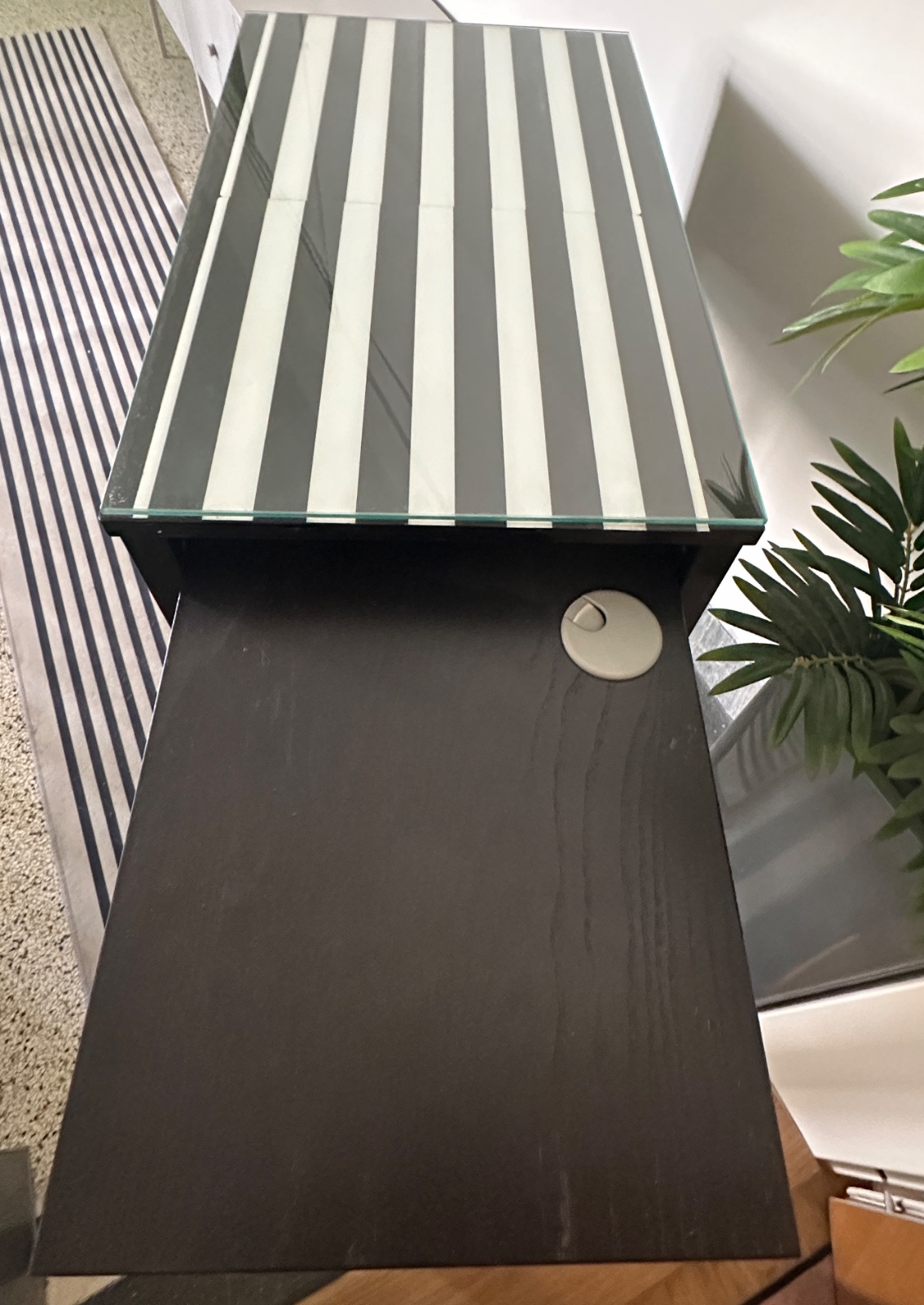 Drevený stolík, s výsuvnou časťou, šuflíkom aj prierezom na káble (v prípade použitia ako PC stolík), v zadnej časti má aj malý úložný priestor. Ideálny do kompaktného interiéru. Šuflík na zamkýnací kľúčik. V dizajne nadčasovej klasiky. V peknom stave, bez viditeľných poškodení, iba drobné bežné použitie.