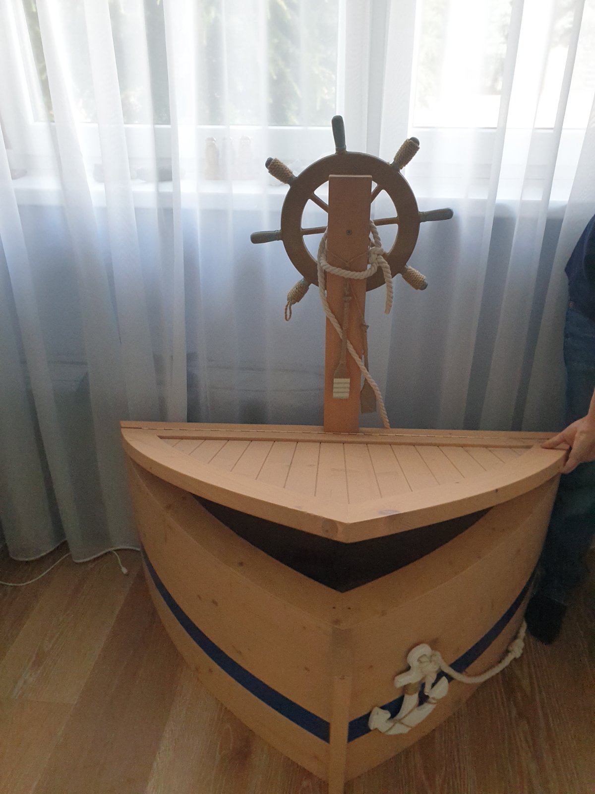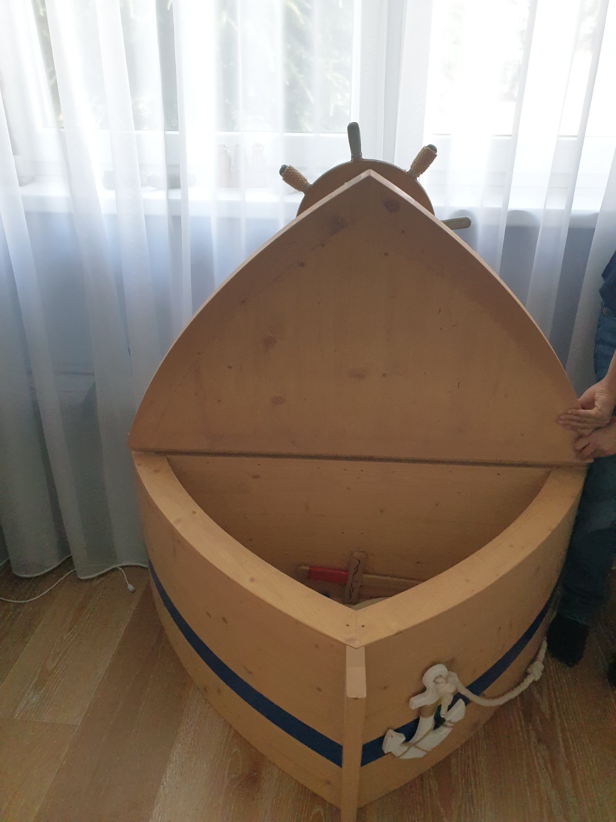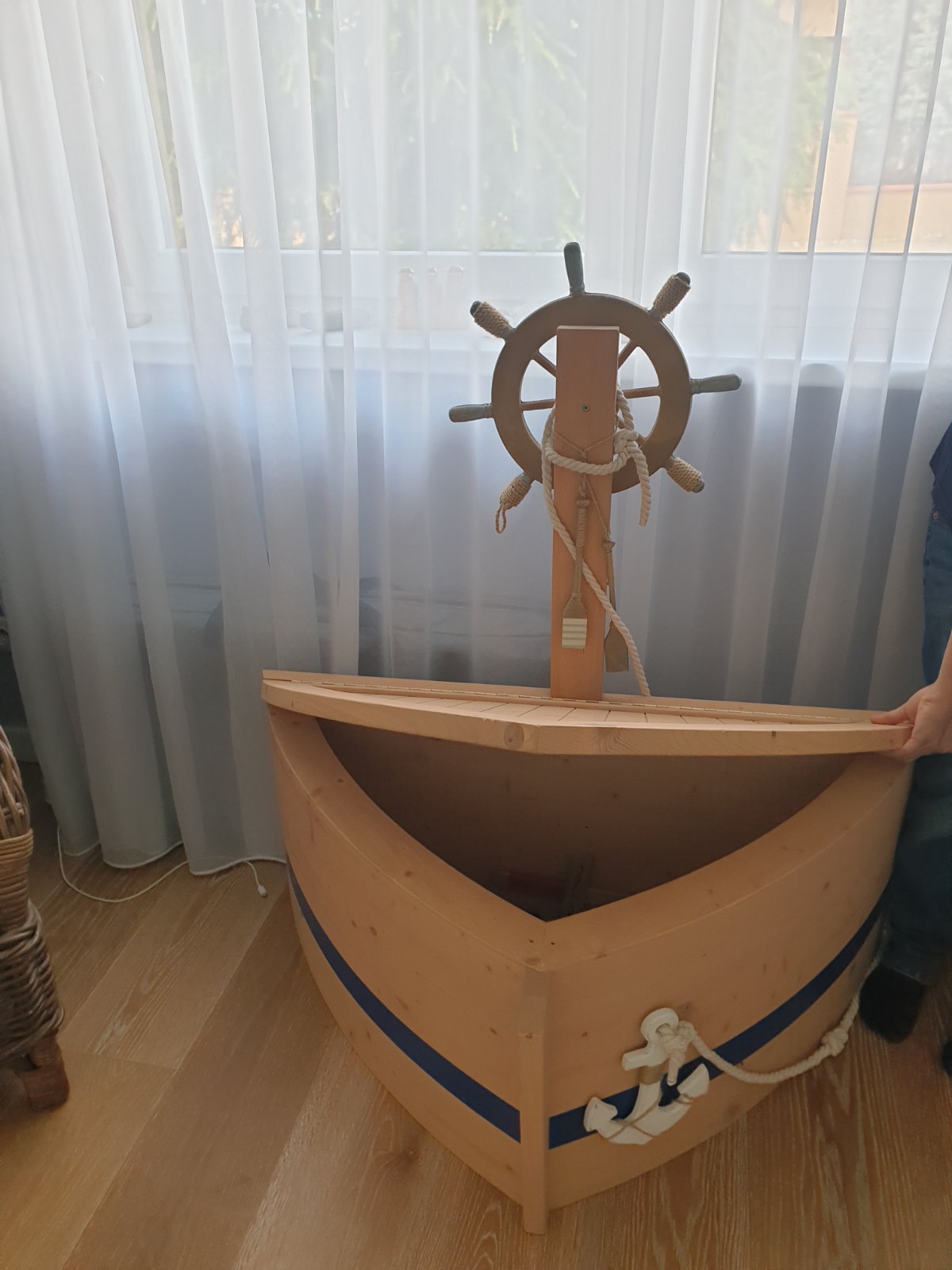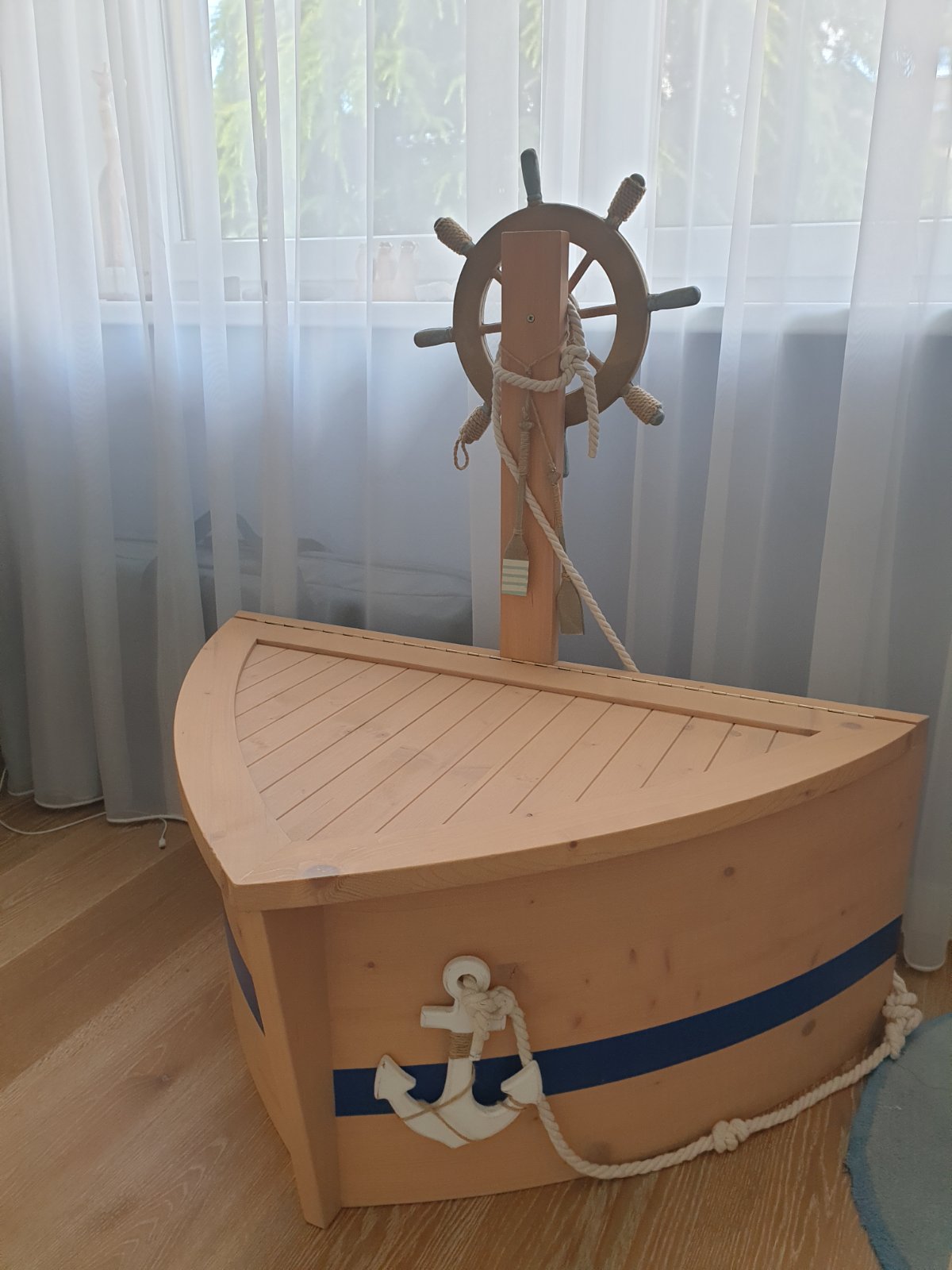 Predam drevenu uloznu skrinku v tvare lode s kormidlom ako pridavok k posteli pripadne ako samostatna skrinka.