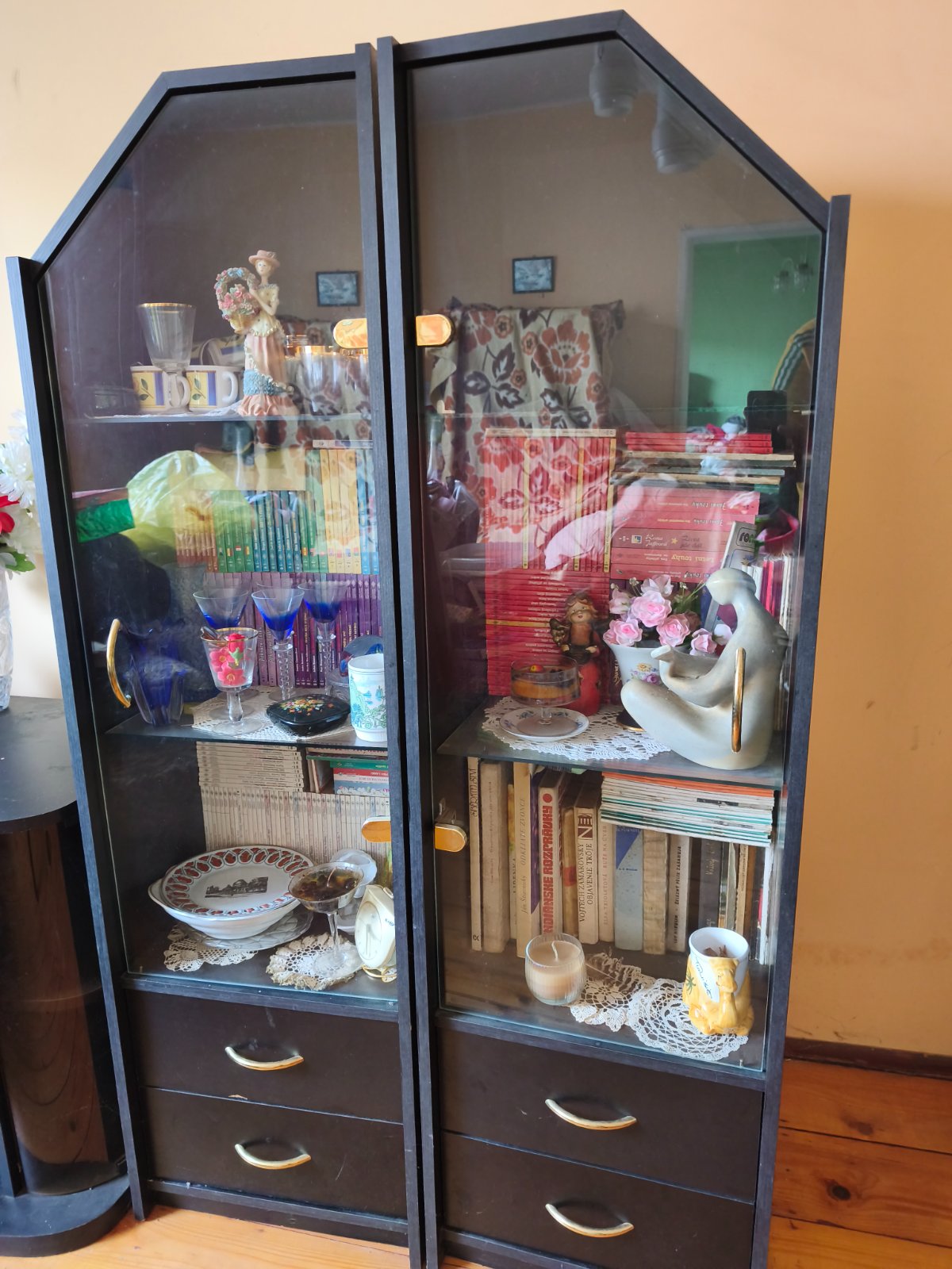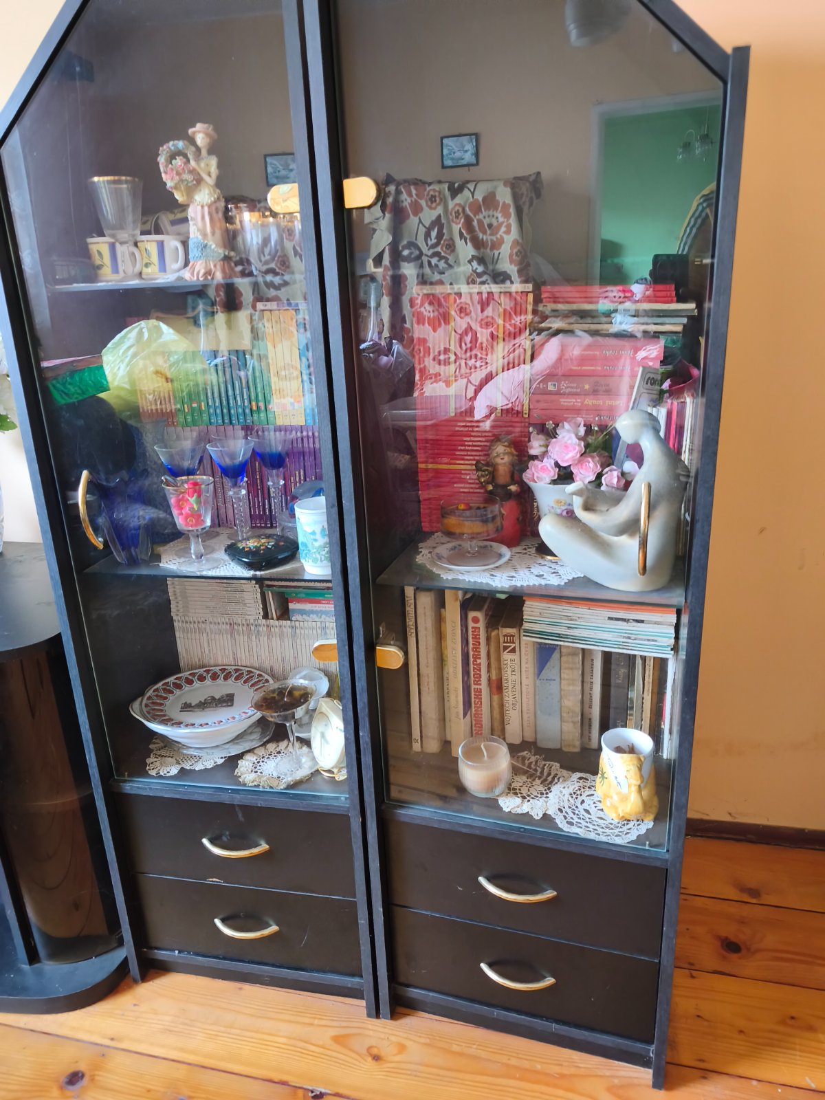Dve oddeliteľné skrinky so šuflíkmi, televízna skrinka. Používané. Bežné známky používania. Ceny osve: skrinky po 20€, televízna 15€.