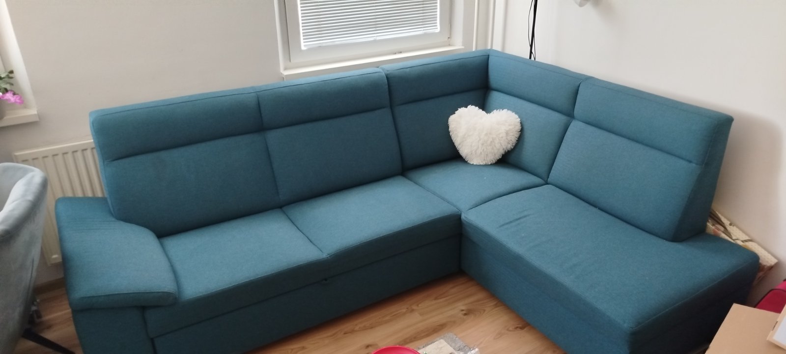 Predám moderný tyrkysový gauč, slovenská výroba, ktorý krásne oživí každý interiér. Vďaka farbe na ňom nie je ľahko vidieť špinu, takže je praktický aj na každodenné používanie.
