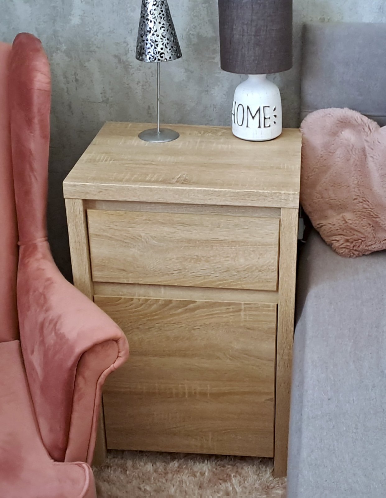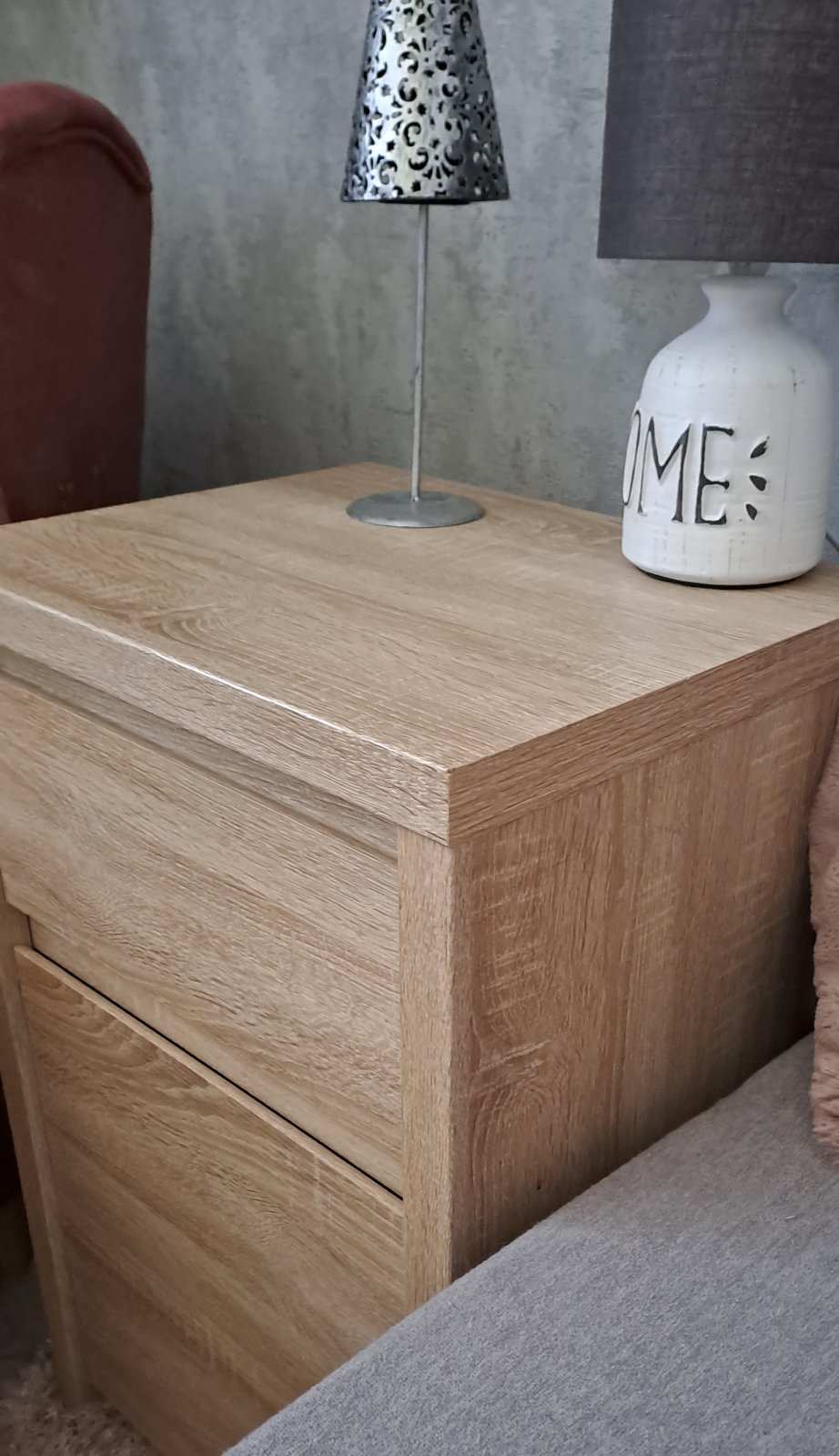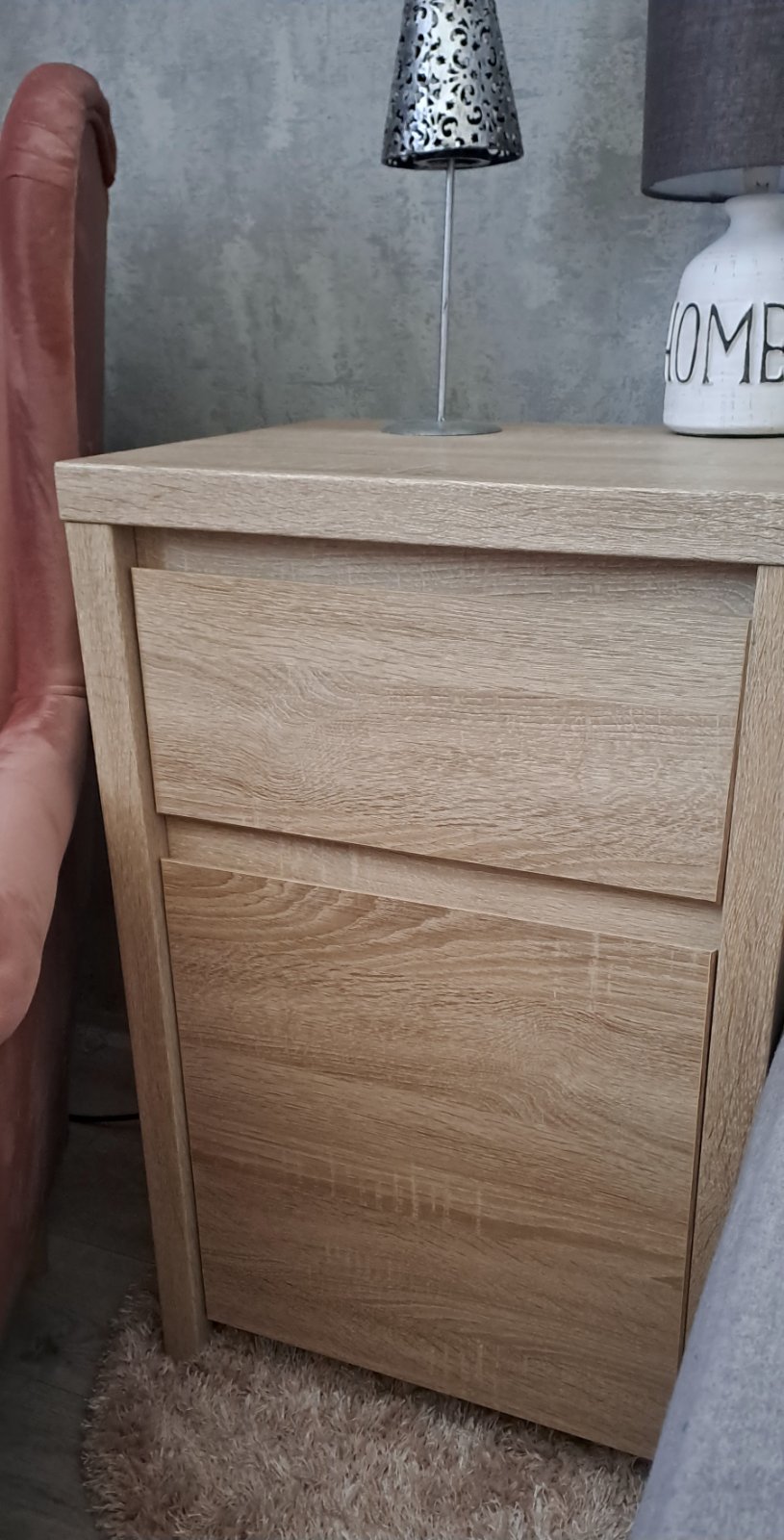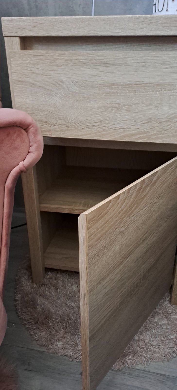 Nočný stolík - komoda v top stave. Drevo dub sonoma. Vrchná časť šuflík, spodná časť dve poličky. Priestranná s dostatočným úložným priestorom.