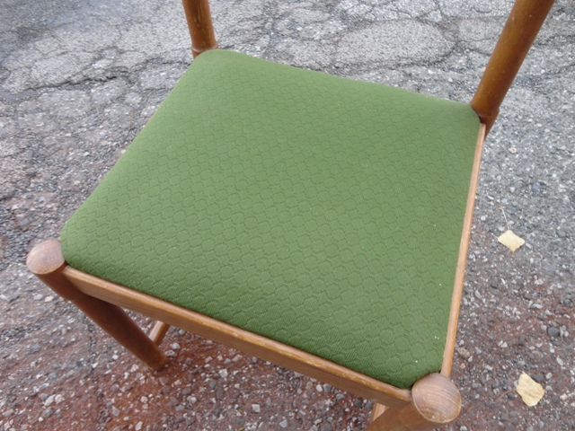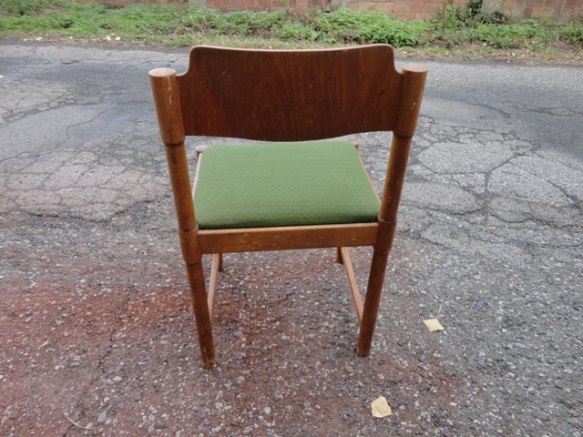 Predám drevené retro JEDÁLENSKÉ STOLIČKY – staršie drevené stoličky, retro dizajnu, hranaté, s čalúnením zelenej farby, výroba: ČSSR. Mám 4 ks.