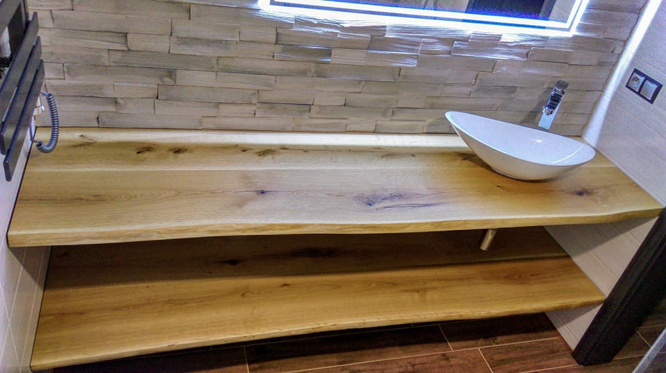 Predám 2 ks masívnych dubových / jaseňových kúpeľnových políc. Rozmery sú približne 1700 x 500 mm (ktoré viem upraviť) s prednou hranou - prírodnou / vlnitou. Ošetrené profesionálnym olejom do vlhkého prostredia.