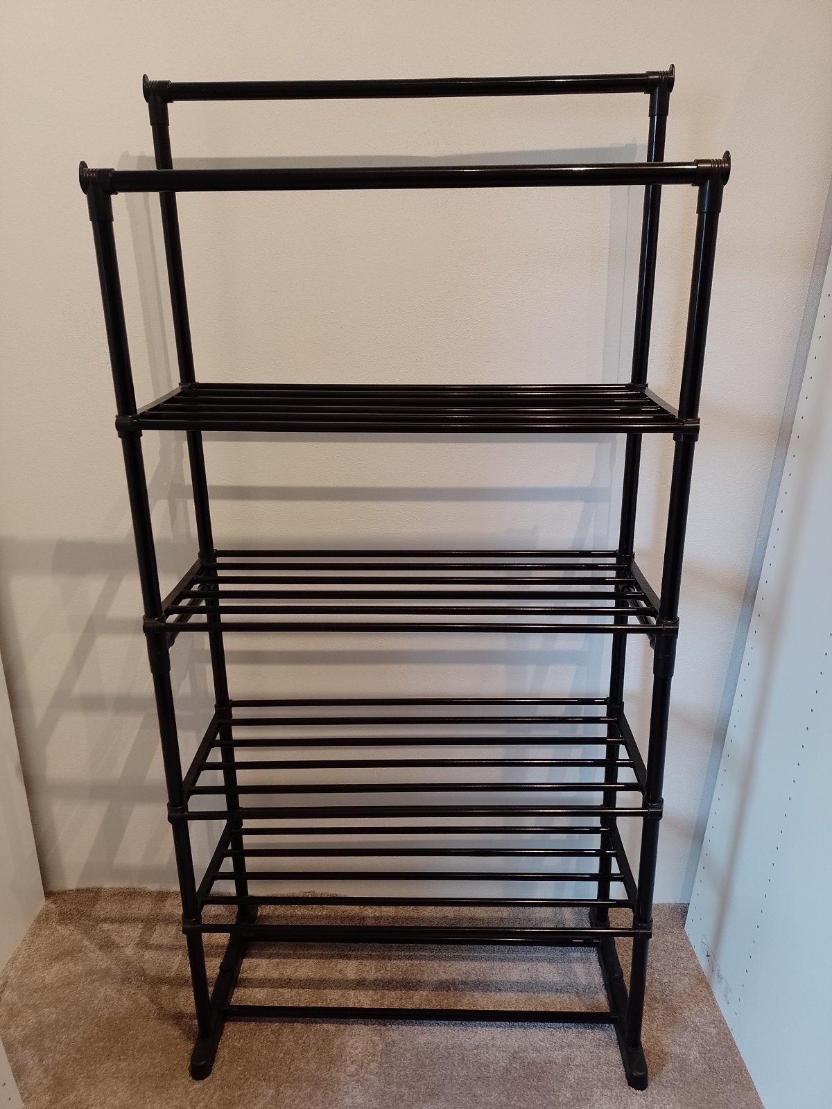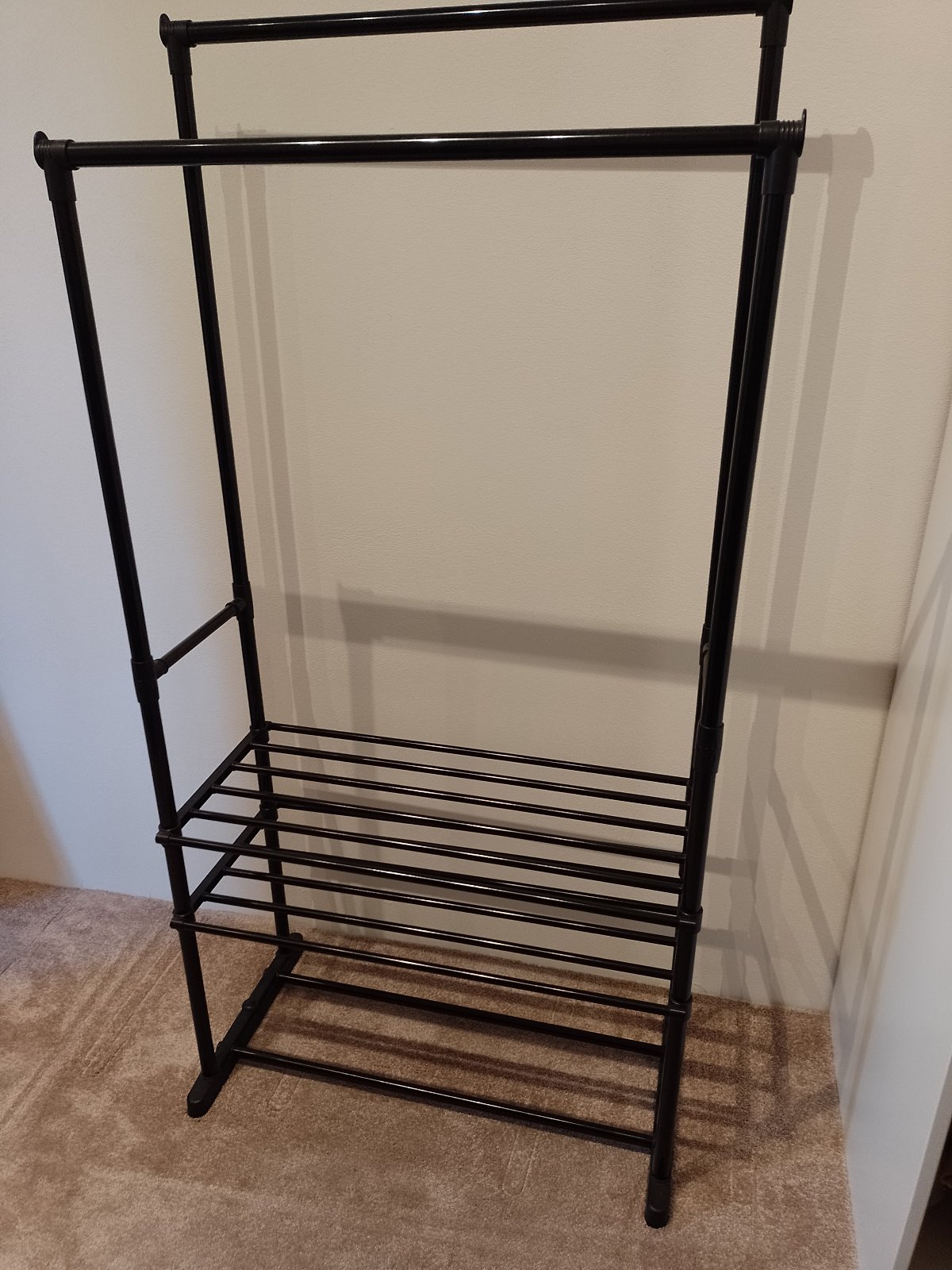 Predám kovové vešiaky na odevy. Pôvodne boli kupované ako dvojradové s 2 policami, my sme si ich prispôsobili svojim potrebám (viď na foto). Najviac by mi vyhovoval odber všetkých vešiakov naraz ale predám aj po kusoch (v tom prípade vyskladám presne podľa návodu). Kolieska nie sú k dispozícii.