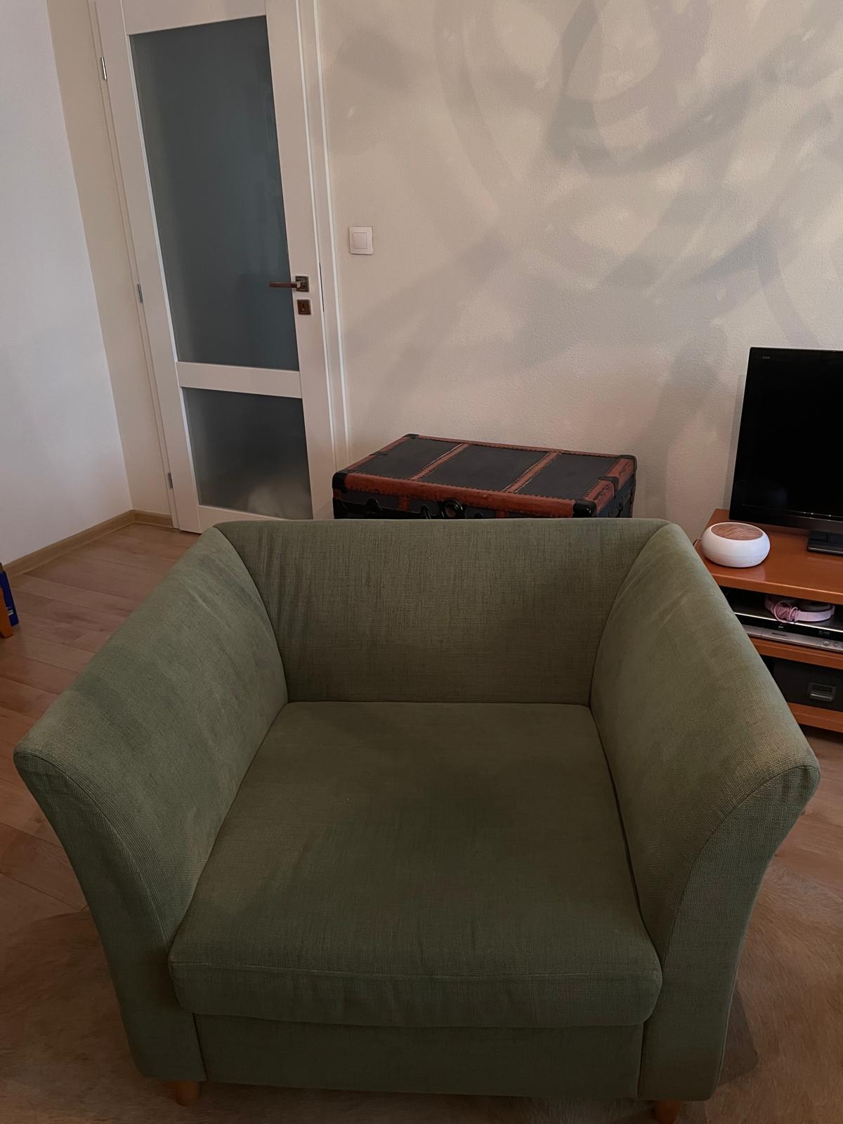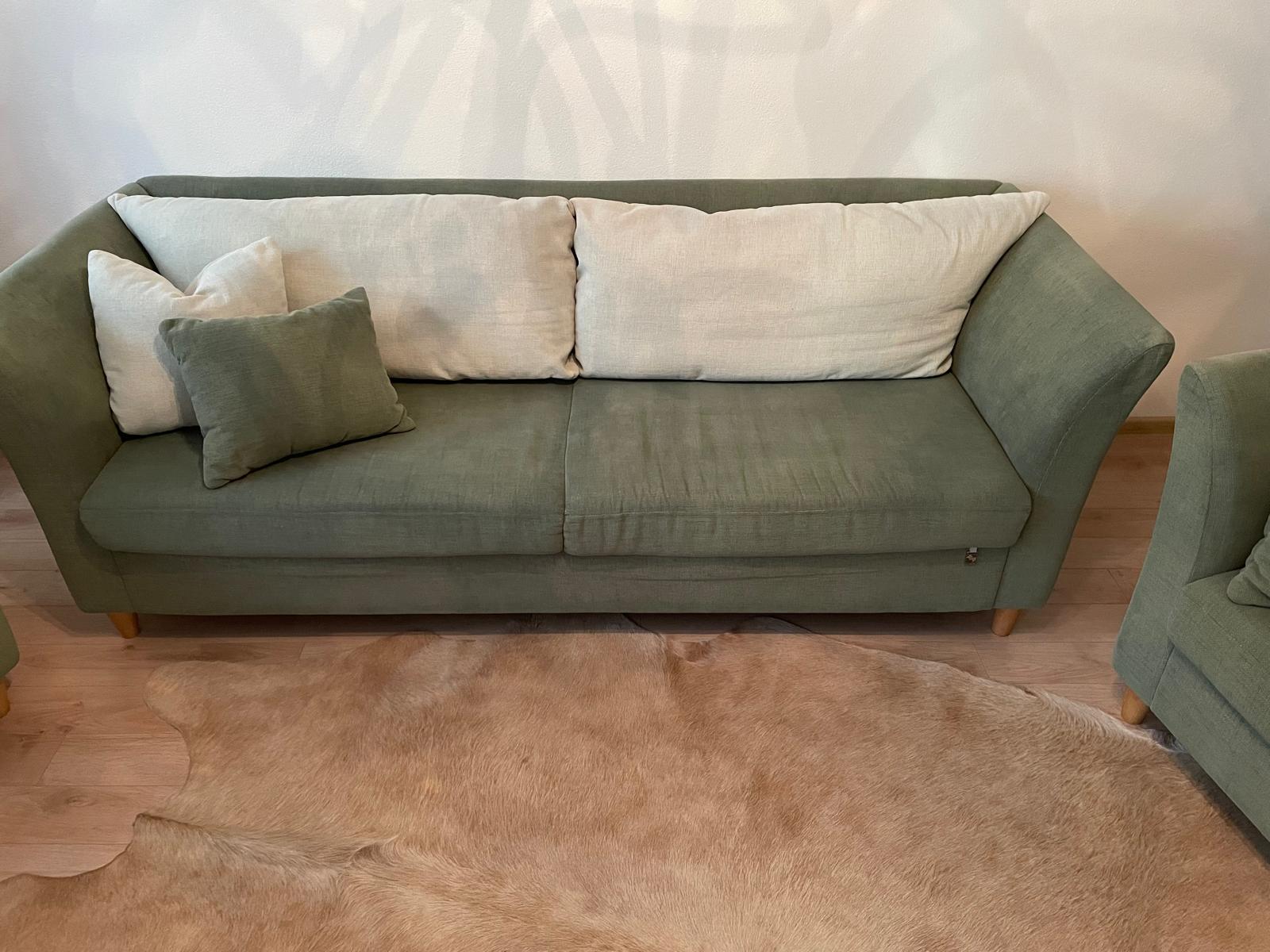 Predám používanú, v dobrom stave sedačku značky Kanapa; látkové prevedenie, farebná kombinácia olivovo-zelená (konštrukcia) a svetlá štrkovo-sivá (chrbtové opierky). Chrbtové opierky tvoria vankúše, ktoré sa dajú odobrať a zväčšia sedacie miesto. Osobný odber.