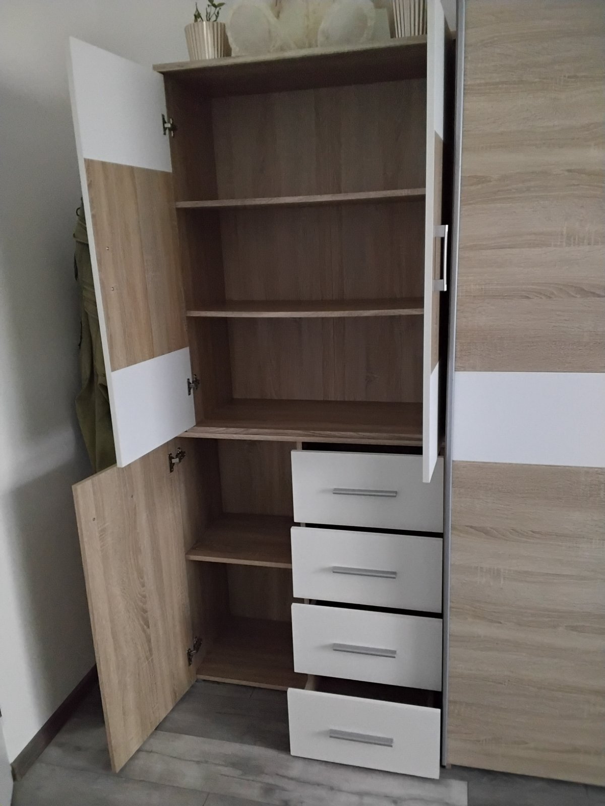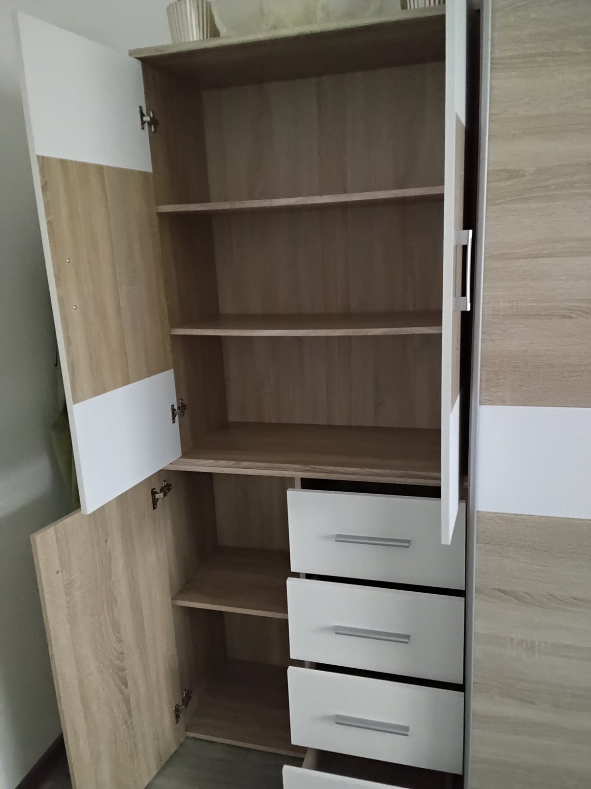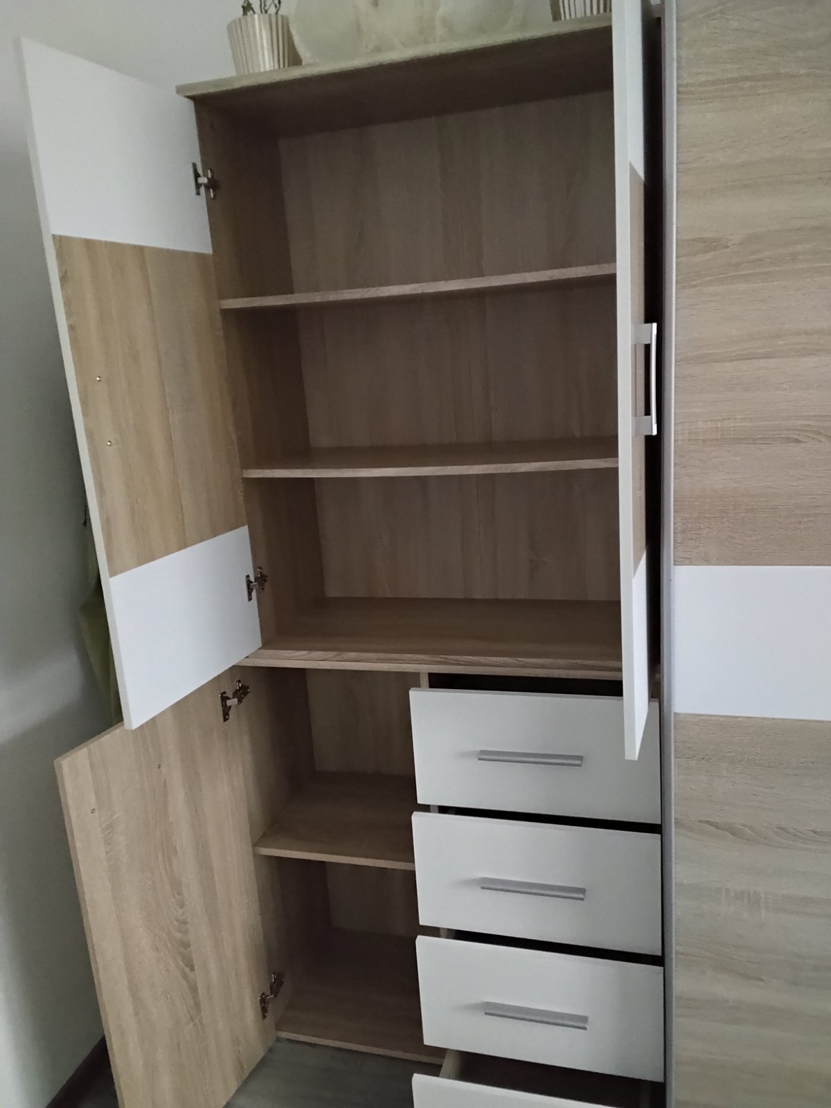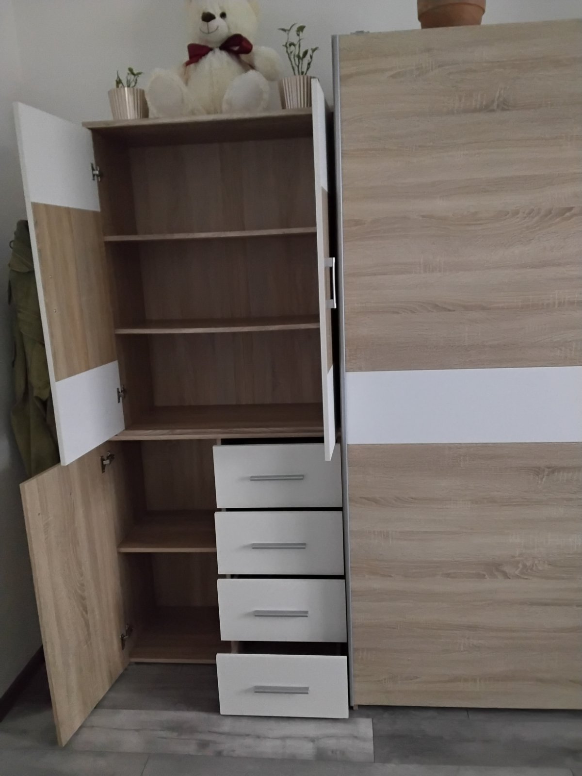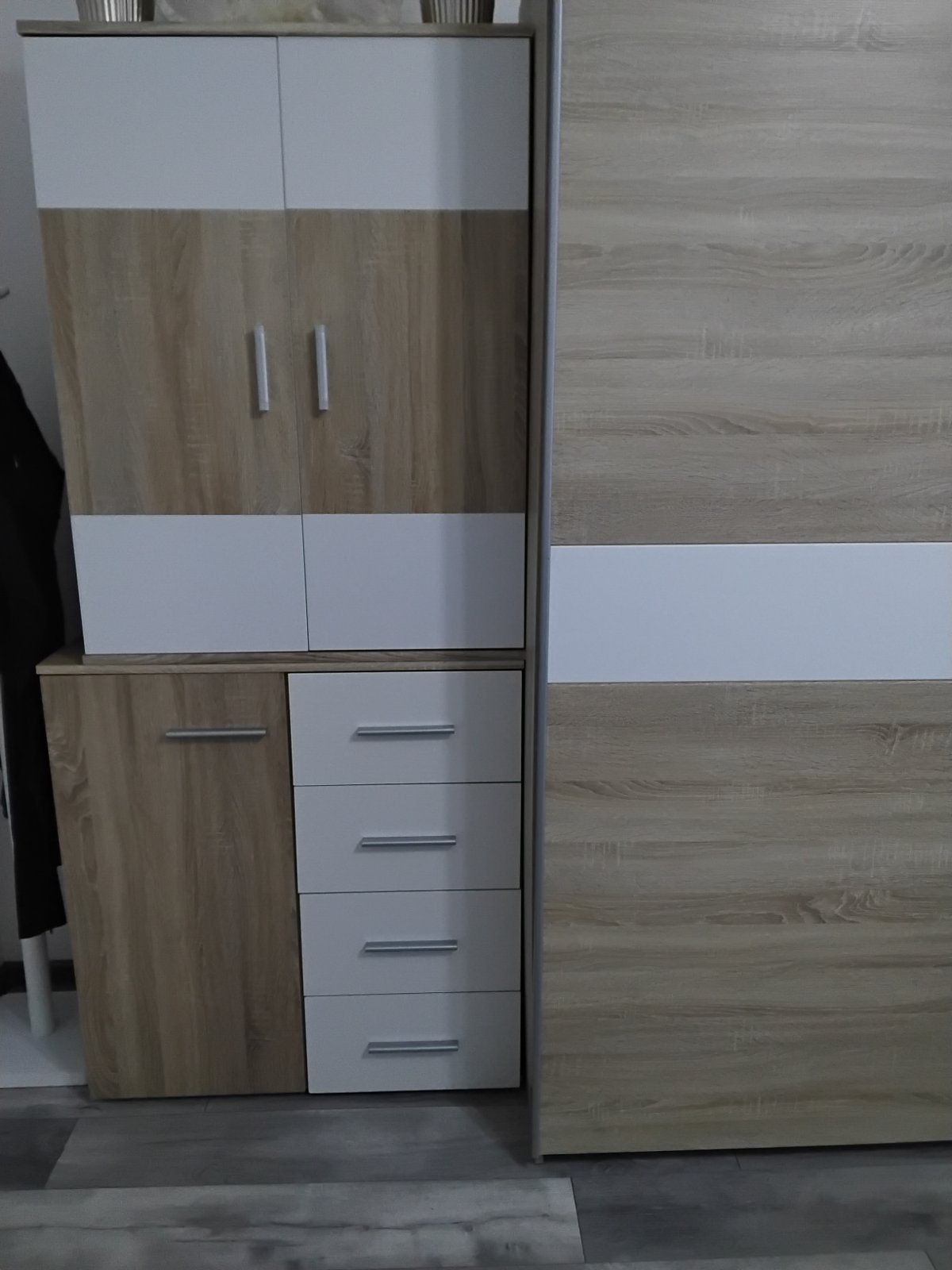 Zostava spolu alebo zvlast vo výbornom stave veľmi praktická či už do obývačky,detskej,spálni dá sa aj zvlášť komoda a zvlášť policka