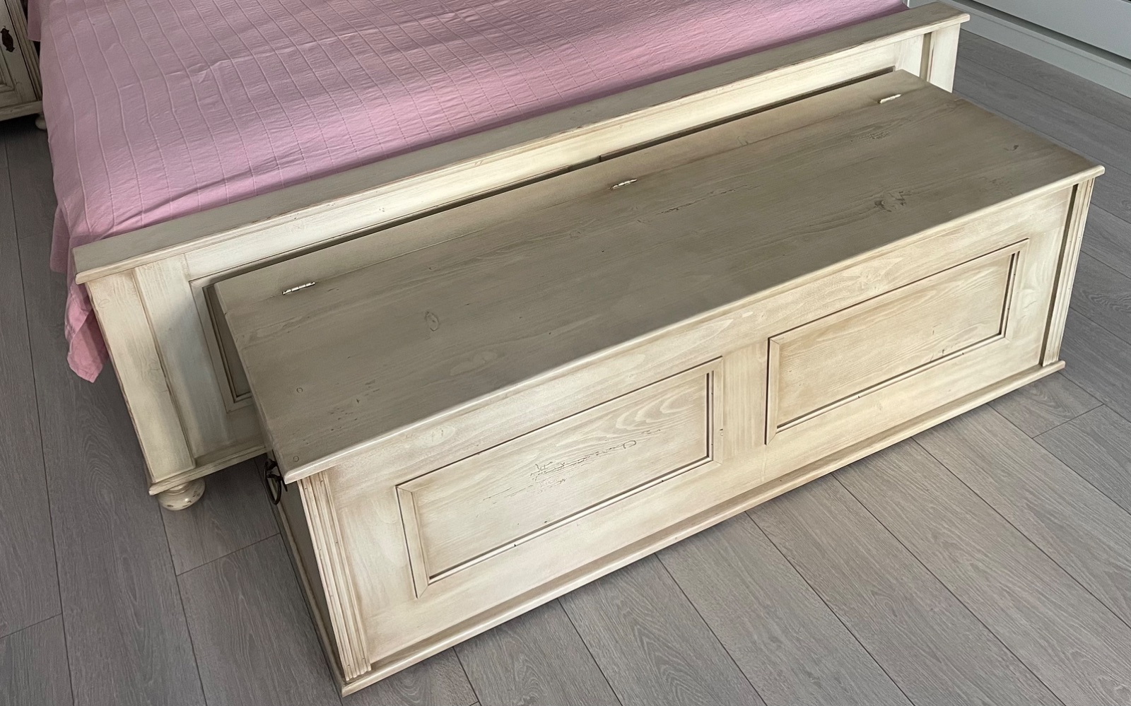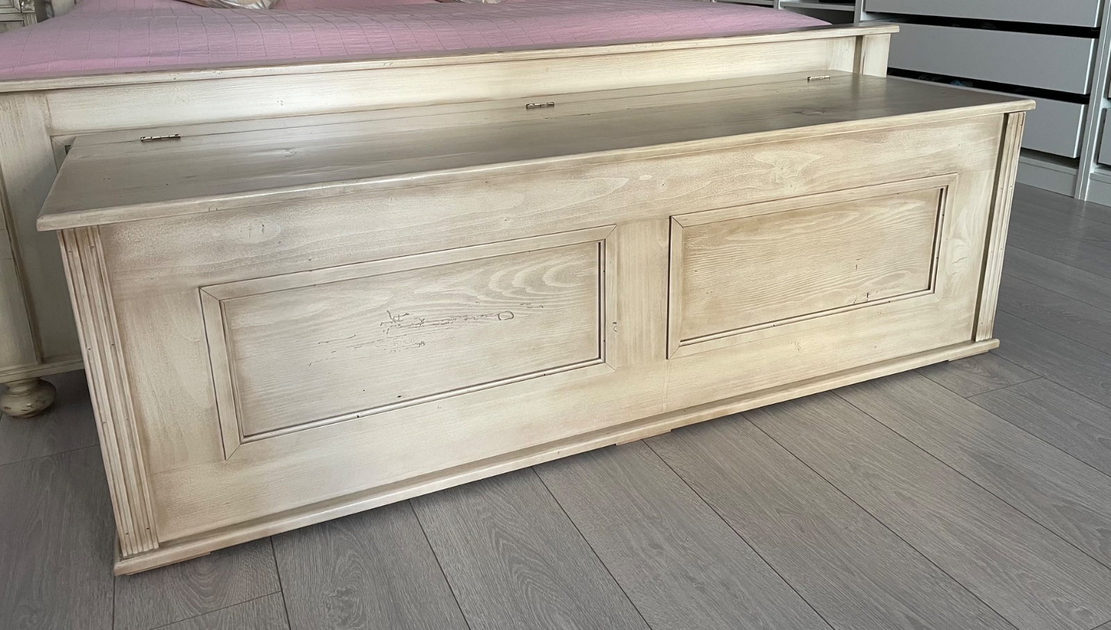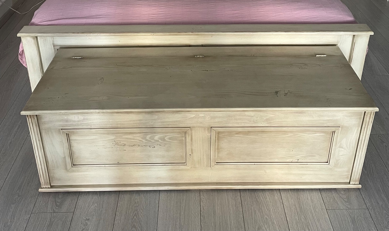 Truhlica vyrobena zo smrekoveho masivu, na mieru, nater patina, rozmer šírka 151cm, vyska 48cm, hlbka 52cm, neposkodena, iba osobny odber