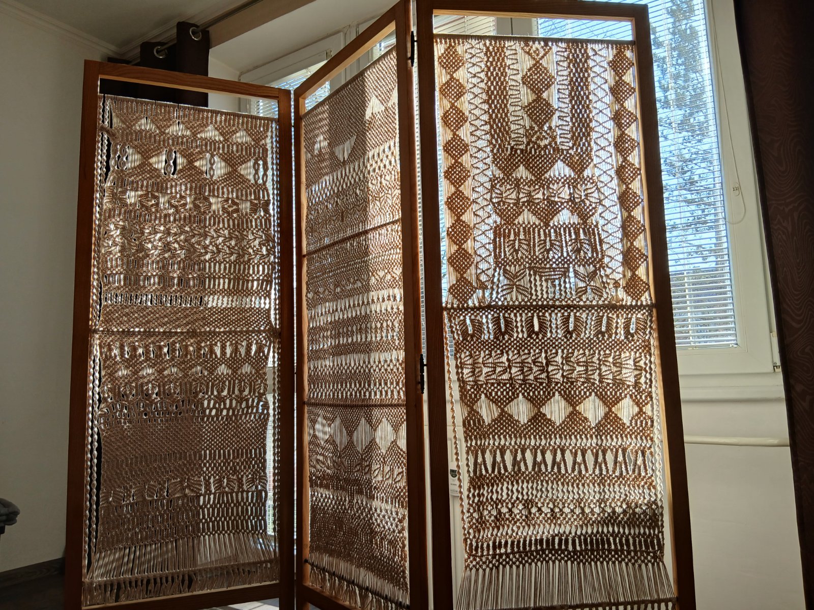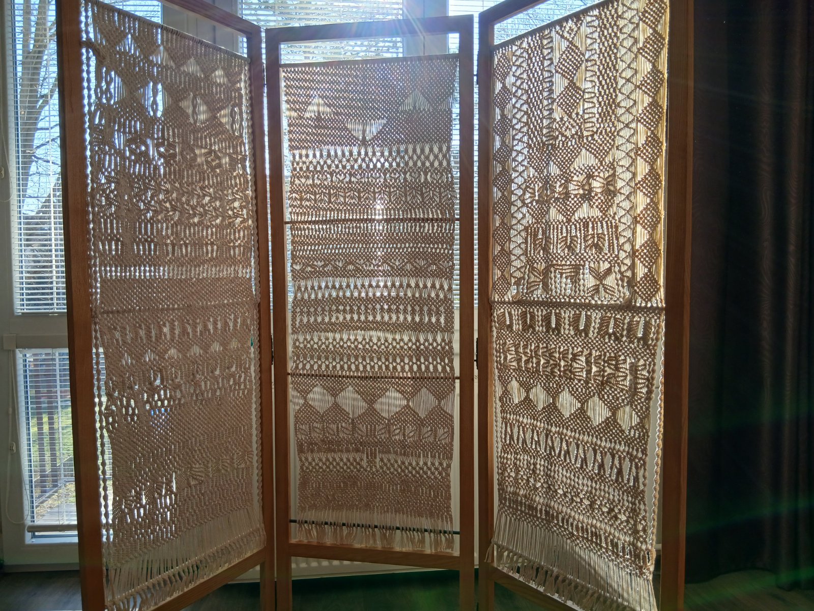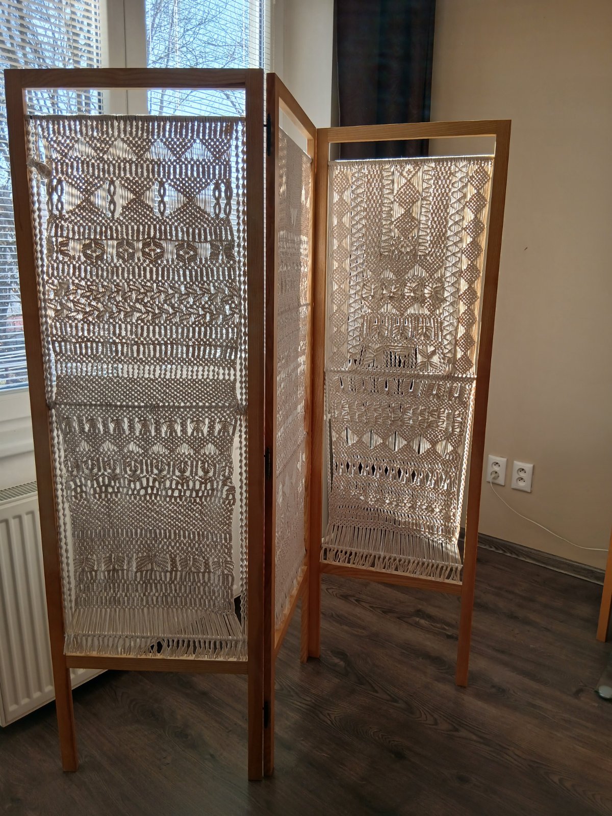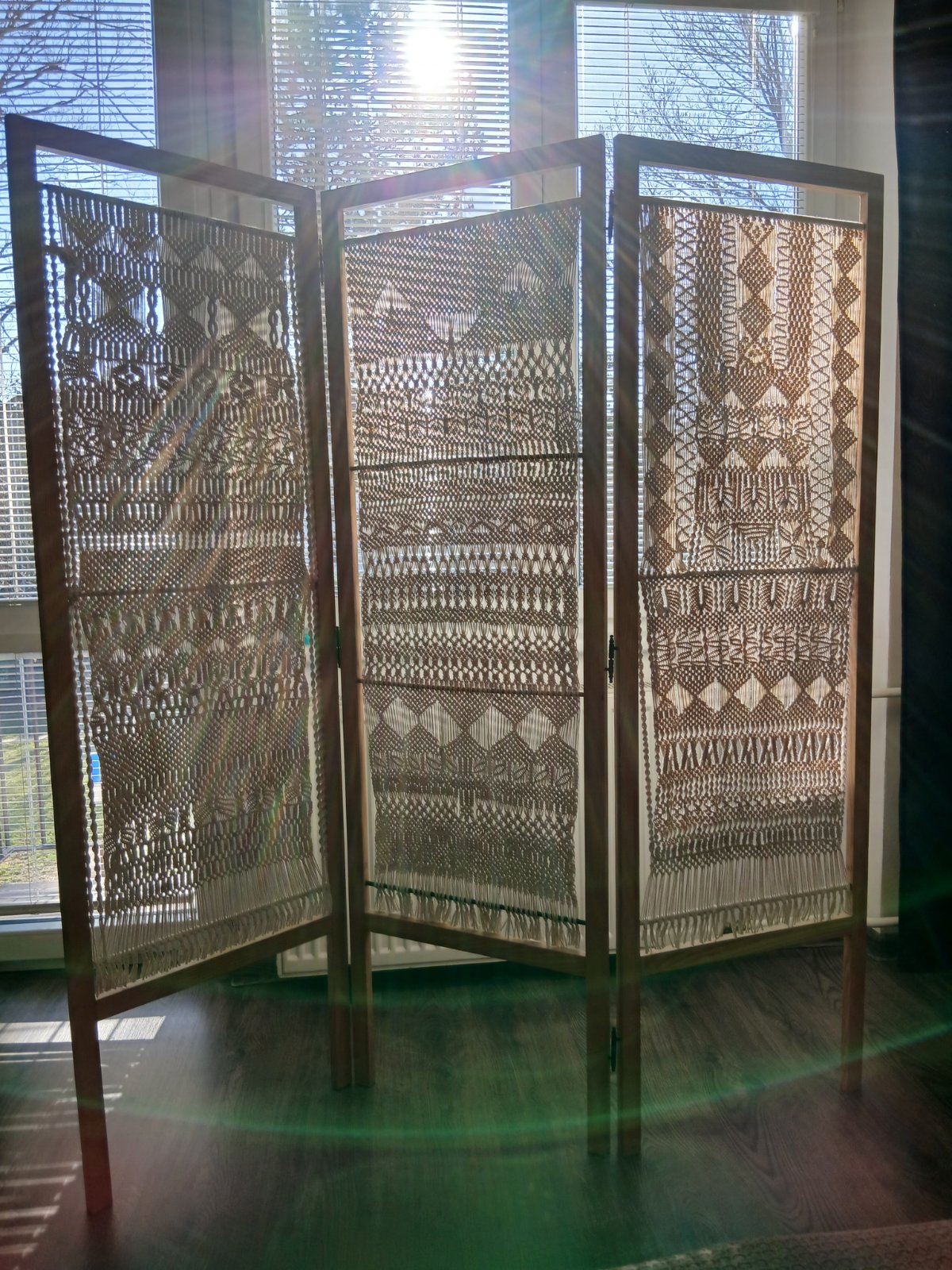 ramy paravanu su z jasenoveho dreva, vyplet je robeny macrame technikou - bavlnenou priadzou