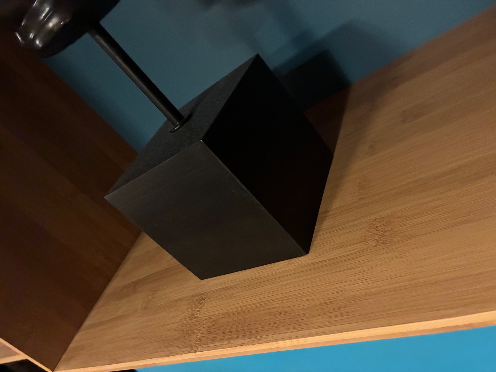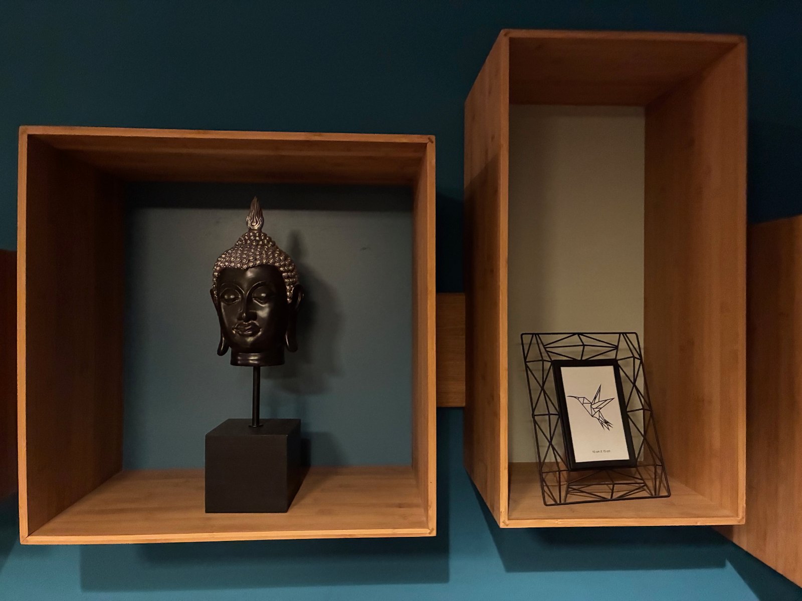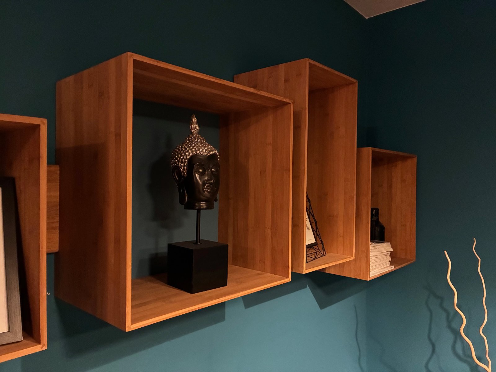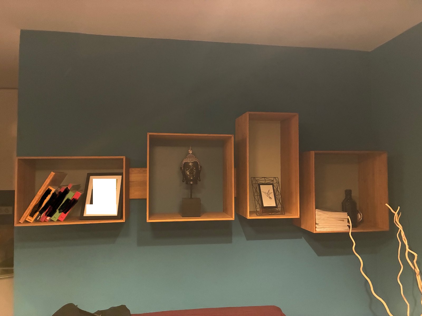 Nástenná polica z bambusového prírodného materialu. Sklada sa z podstavy, ktorá sa primontuje na stenu a styroch samostatných boxov, ktore si možete na nu lubovolne navliect a vytvorit si tak zoskupenie tvarov a vysok presne podla svojich predstav... Kazdy box ma chrbat inej farby, pre predstavu stena na ktorej je fotená má dlzku 250cm...Je bez poskodeni, iba osobny odber v BA.