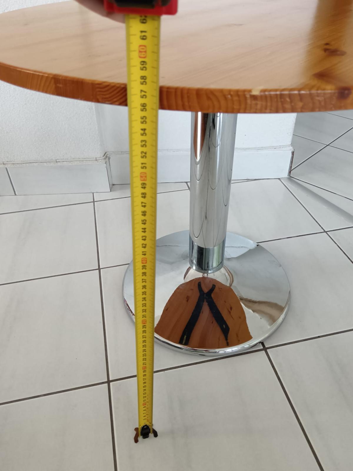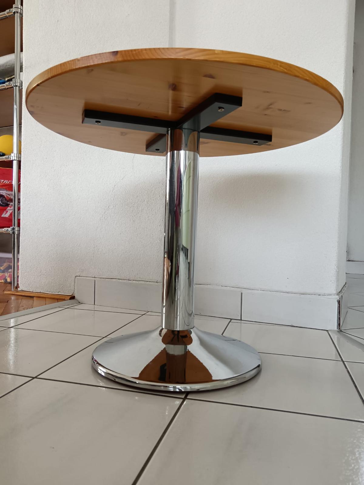 Predám okrúhly kaviarenský/príručný stolík, doska - masívne drevo (lakovaný povrch), pochrómovaný podstavec, nemá žiadne poškodenia, rozmer: výška 58 cm, priemer 69 cm. osobný odber Levice, prípadne môžem doviesť do Bratislavy.