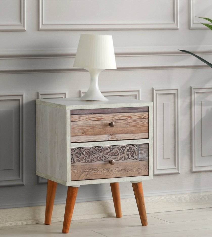 Nočné stolíky LIZA MALMÖ vyrobené v orientálnom štýle zároveň pôsobí luxusným dojmom. To má na svedomí kombinácia dekora orecha s bielym odtieňom. Dostatok úložného priestoru poskytujú dve vložené zásuvky, ktoré sú vybavené kovovými rúčkami. Originálny dekor predných plôch zásuviek s tlačenými exotickými vzormi vytvára atmosféru unikátnosti. Diagonálne postavené nohy s drevenými prvkami zase stolíku dodávajú prírodný nádych.