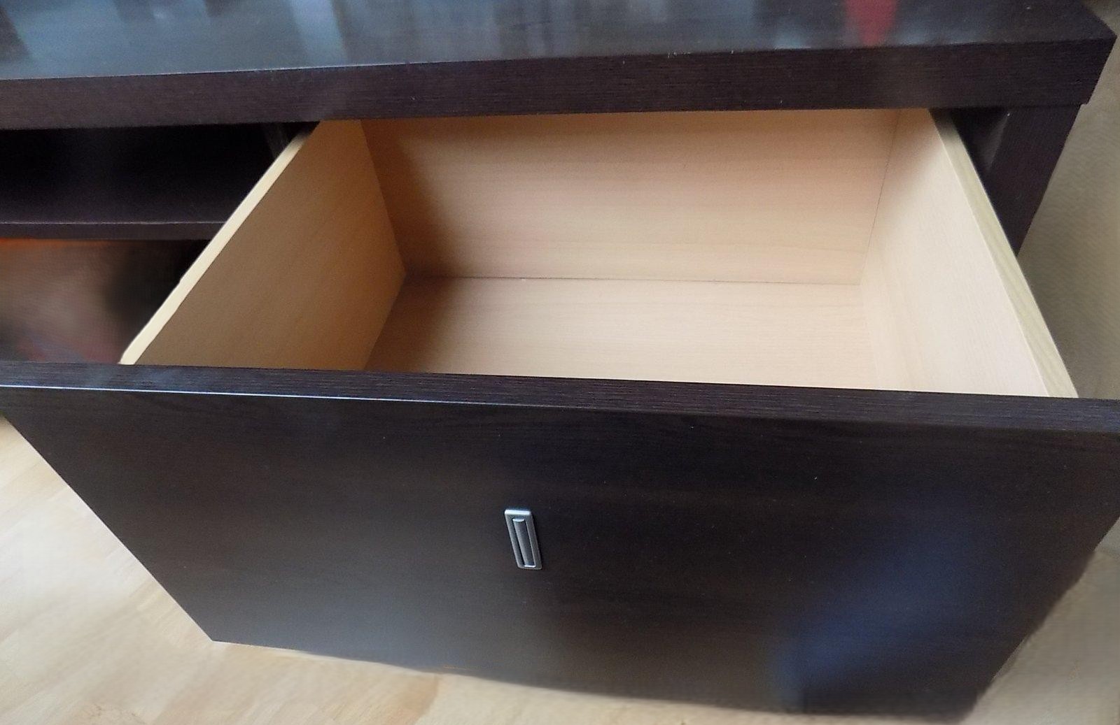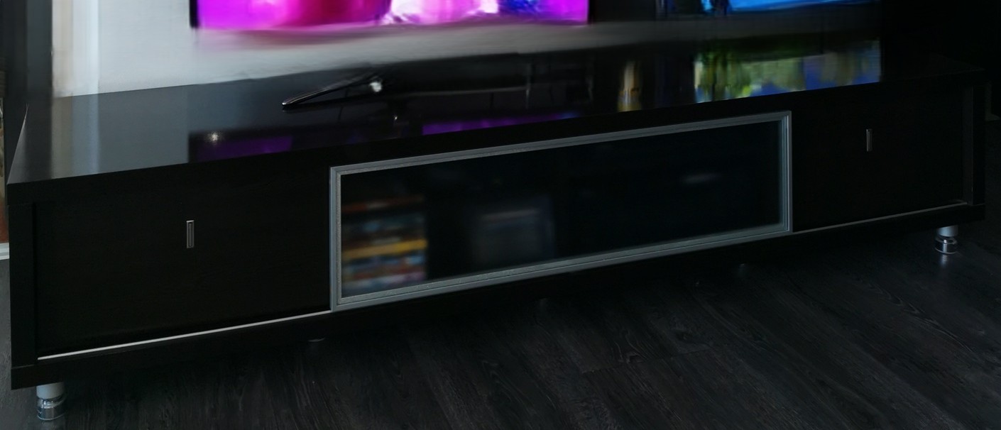 V strednej časti (za posuvným sklom) sú štyri priečinky na elektroniku v zadnej časti je výrez na káble. Vpravo a na ľavu sú šuflíky so skritým úchytom. Posuvné sklo krásne kĺže v kolajničke, jednoducho sa dá vybrať v prípade čistenia.