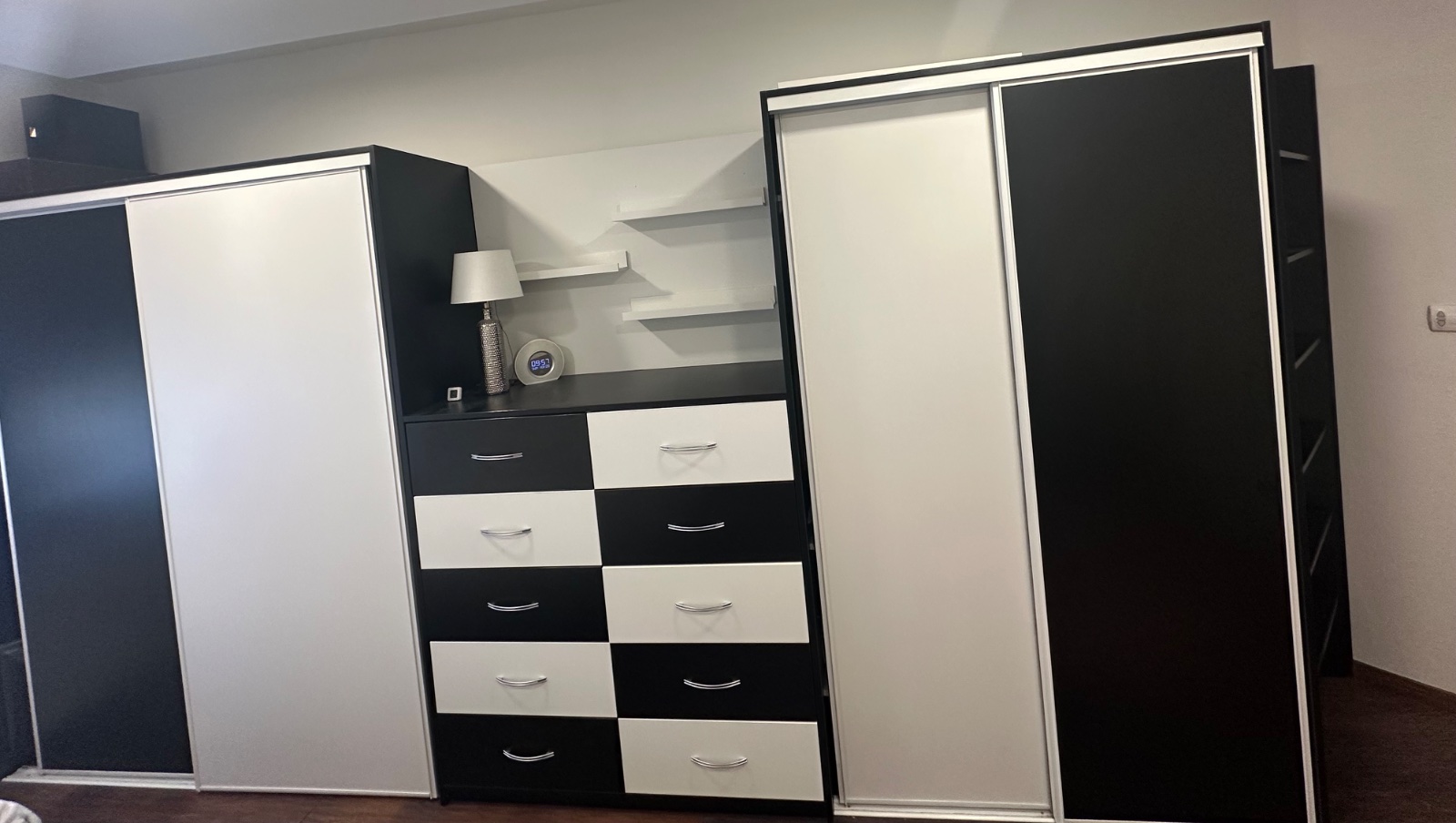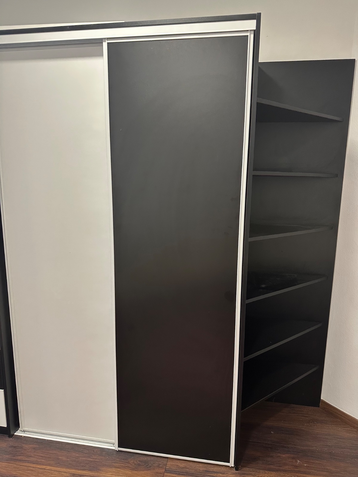 Predam peknu skrinovu zostavu ciernobielej farby vo vybornom stave. Vratane kompletneho vnutorneho vybavenia. Skrine su na polovicu polickove a polovicu vesiakove s 2 polickami. Polickove casti obsahuju aj ulozne kosiky. Celkova sirka 480cm( 180cm+120cm+127cm+53cm), hlbka 60cm, vyska 210cm. Pri rychlom jednani dohoda mozna.