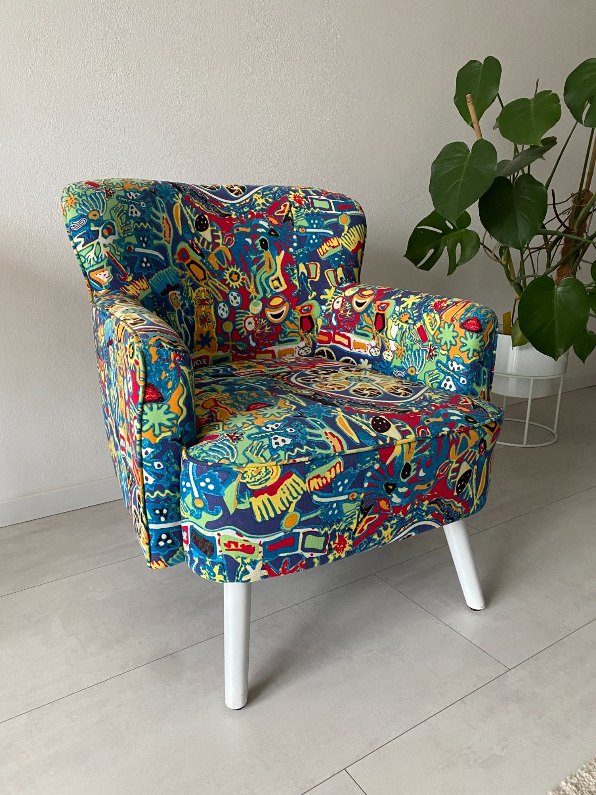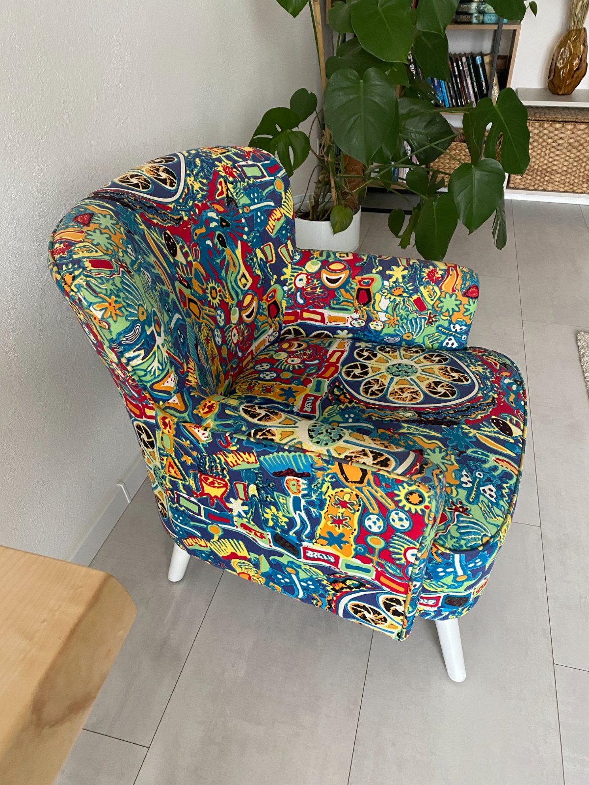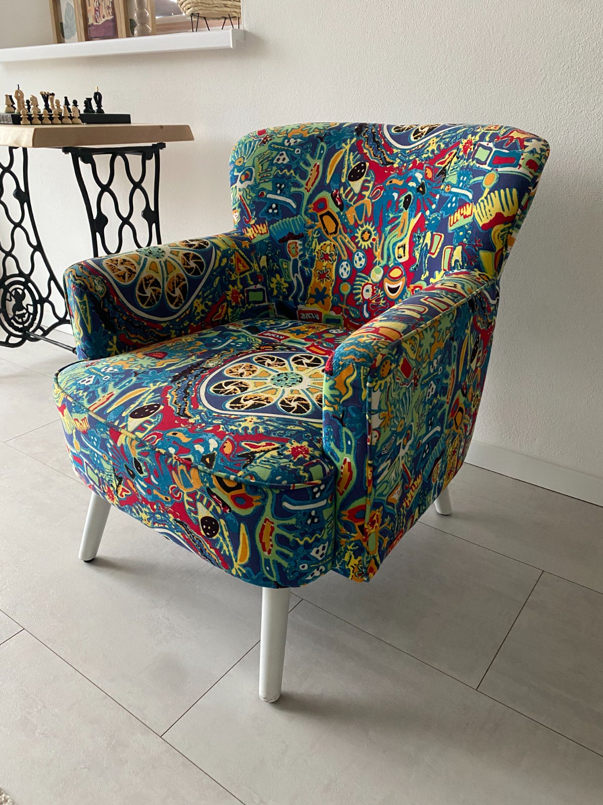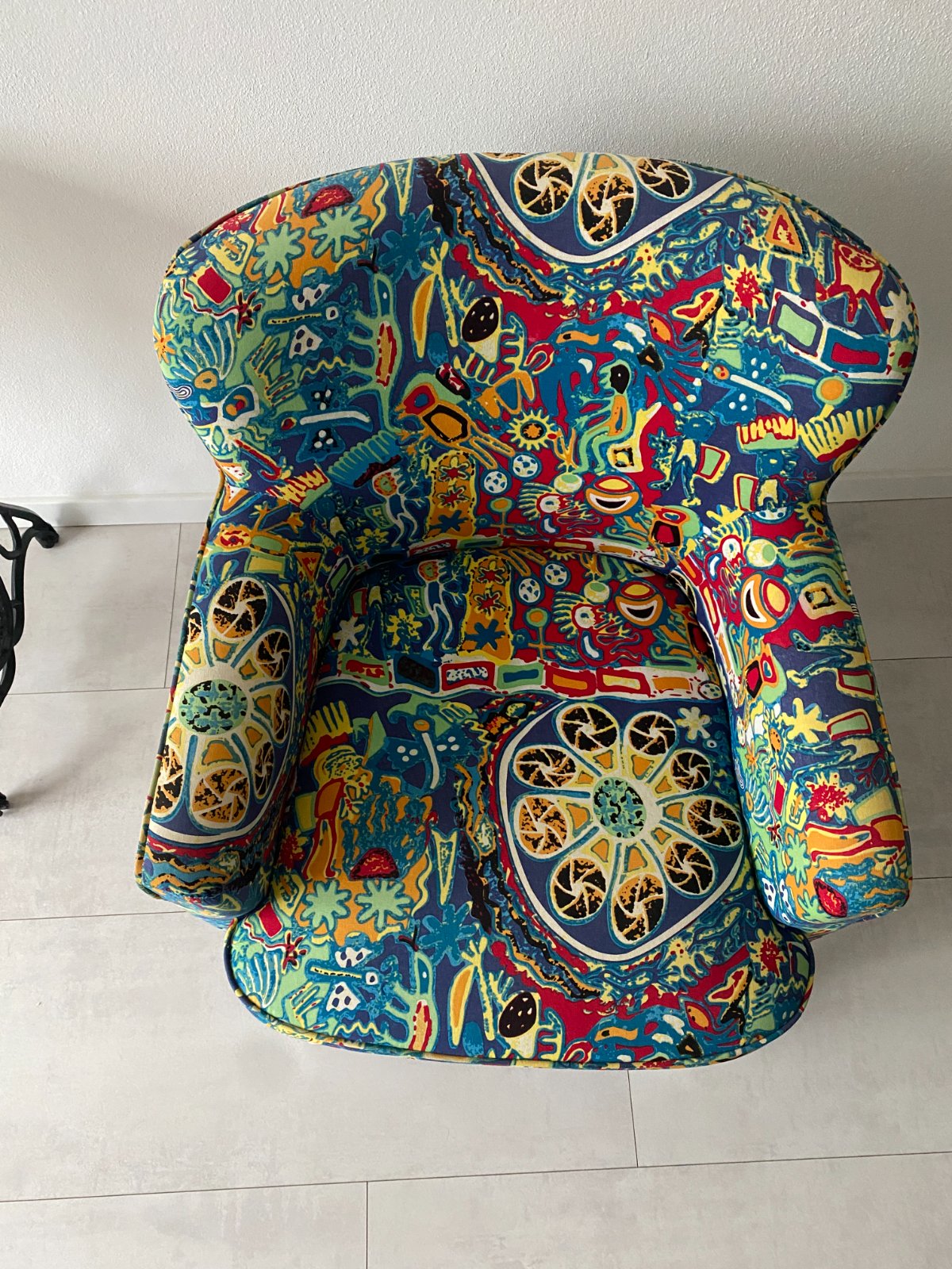 Predám málo používané pestrofarebné dizajnové kreslo, často zakryté dekou, kvalitný a pohodlný matrac na sedenie. Nožičky prestriekané na bielo, jemne ošúchané dve nohy od vysávača, stačí nastriekať bielym lakom, málo viditeľné.