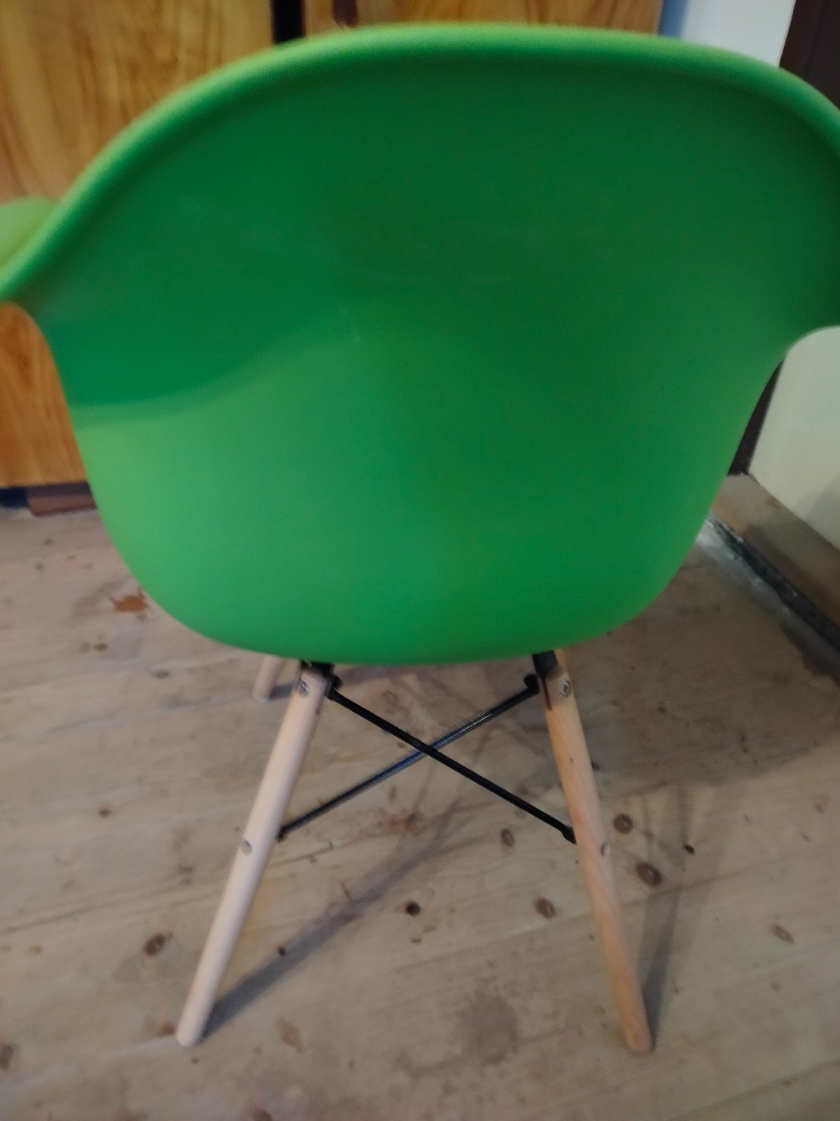 Predávam používanú jedálenskú stoličku v krásnej limetkovo-zelenej farbe (svieža jablková zelená). Moderný retro dizajn, plastový sedák, masívne drevené nohy (buk), čierne spojky.