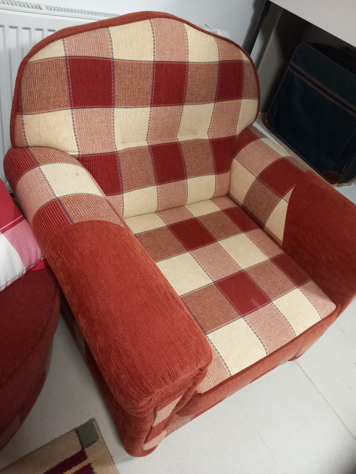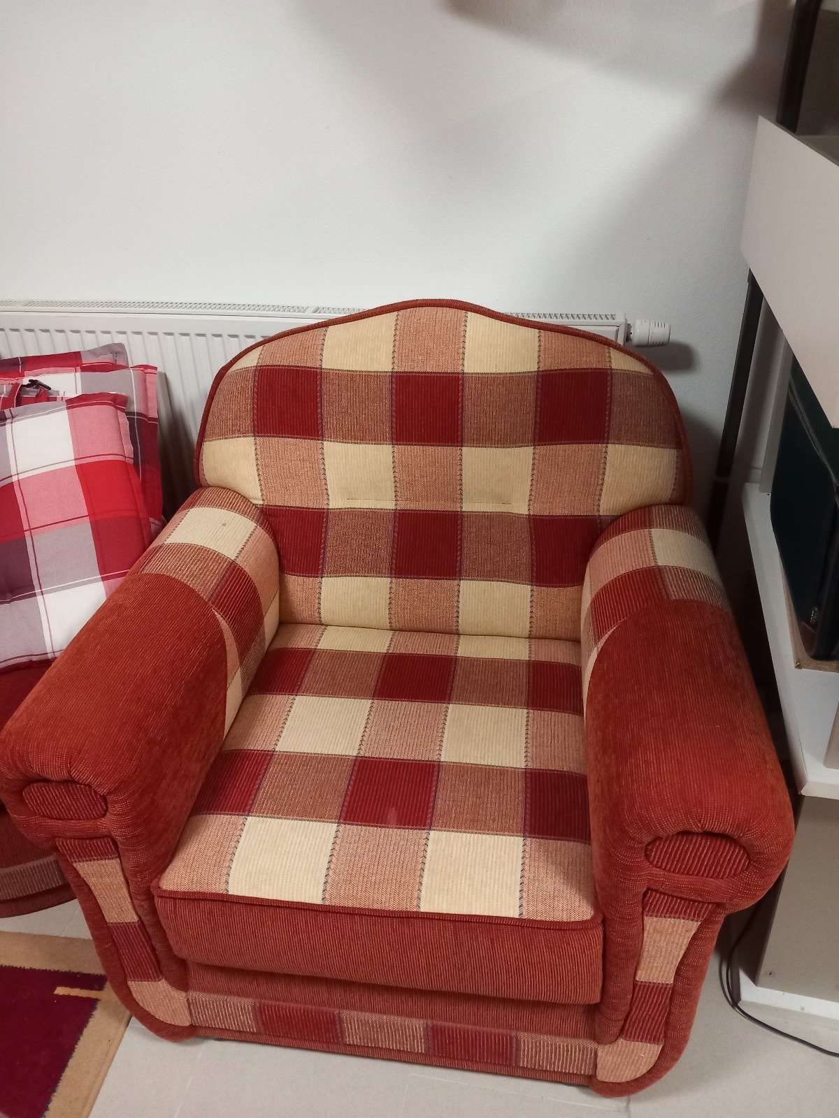 Používaná cca 2 roky, čalúnenie je poškodené, nohy nepoškodené.