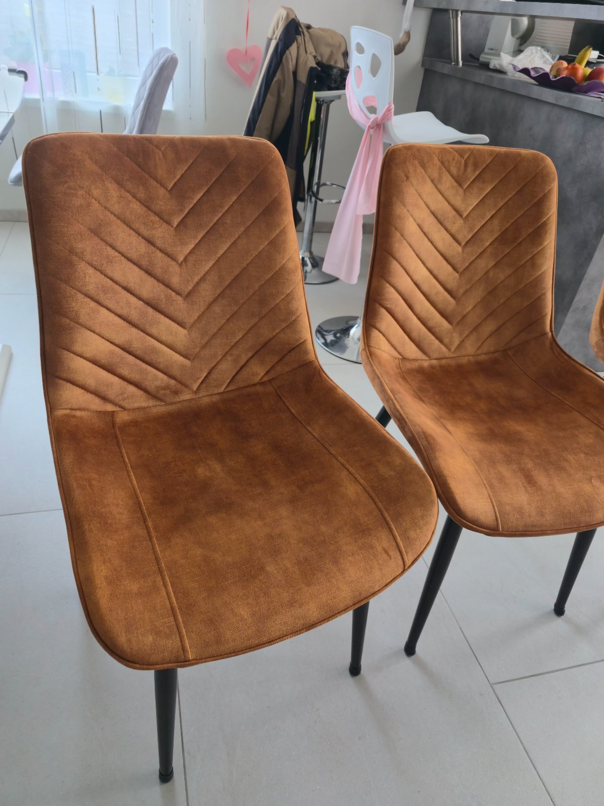 Kvalitné stoličky z pravého dreva v kombinácii s kovom. Pevné, vhodné k jedálenskému stolu. Odtieň dreva je zrejme čerešňa. Stoličky sú výbornom stave, s bežnými známkami používania, sem tam malé c...