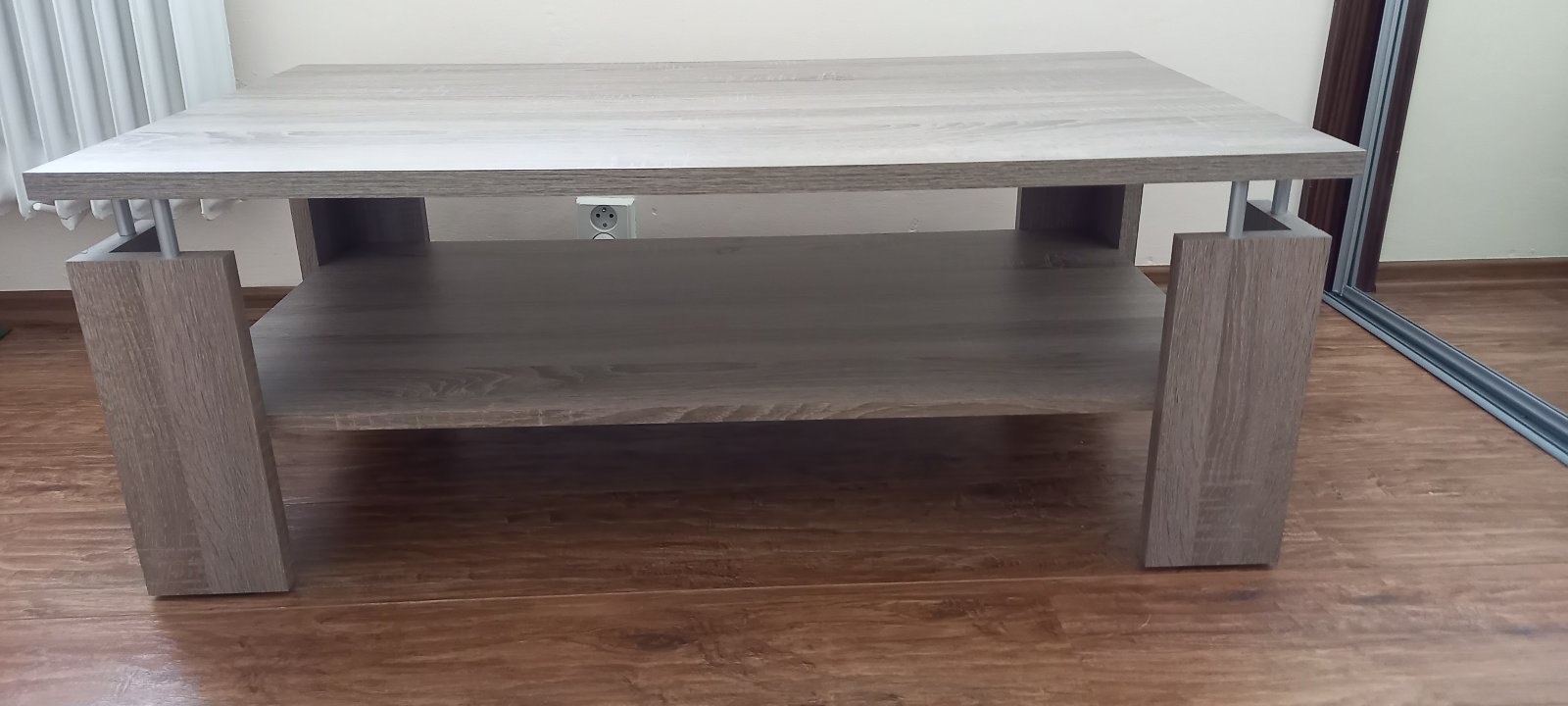 Konferenčný stolík s odkladacím priestorom, bez poškodenia. Svetlo sivo hnedý dizajn dreva. Rozmery