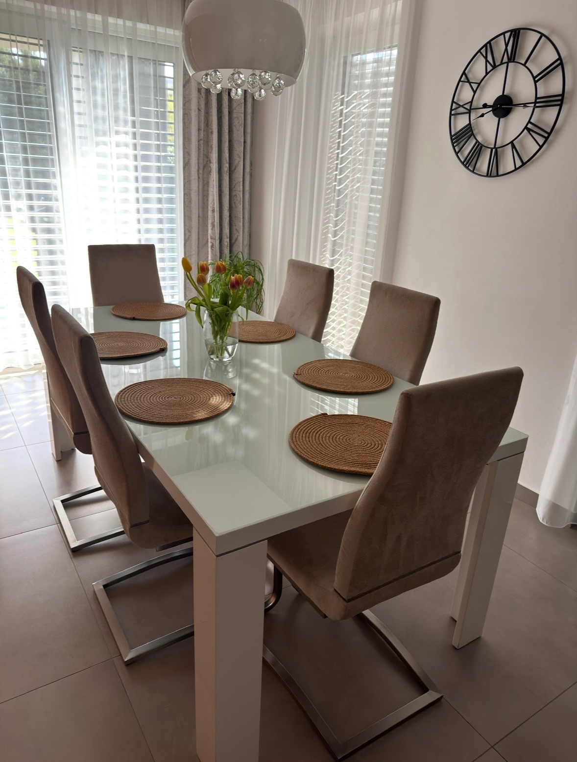 Predám jedálenské stoličky 6 ks. Stoličky sú v bežnom opotrebovanom stave, stabilná konštrukcia.