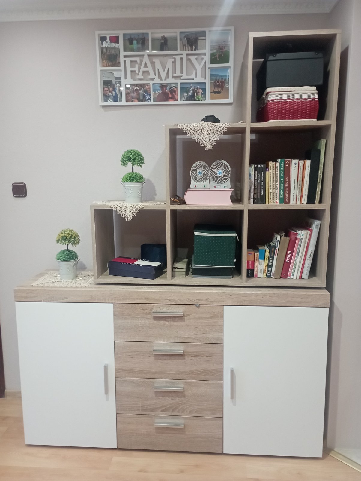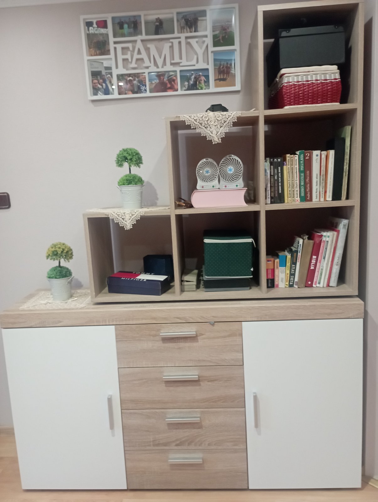 Zostava spolu alebo zvlast vo výbornom stave veľmi praktická či už do obývačky,detskej,spálni dá sa aj zvlášť komoda a zvlášť policka