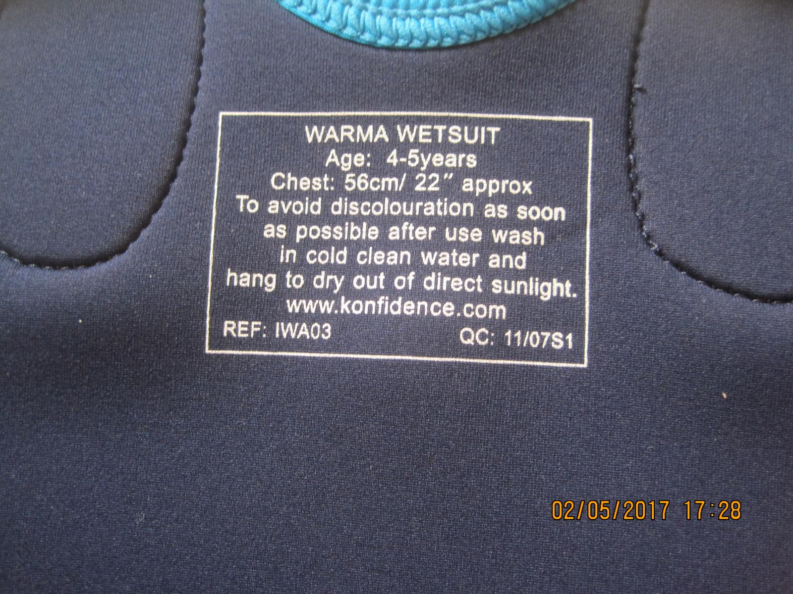 Detský neoprén bez poškodení, s nastaviteľnými ramenami na suchý zips. Kupovaný tu na MK, my sme použili asi len 2x. Veľkosť cca 110 alebo ako je uvedené na štítku 4-5 rokov (ale aj viac), šírka okolo nohy 2x 14,5-15 cm.