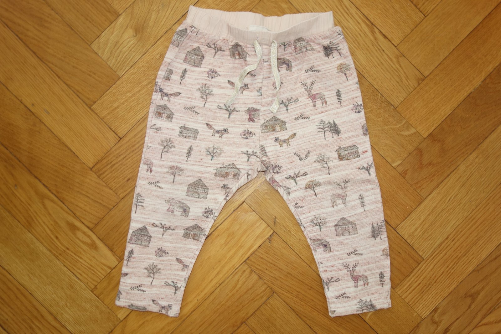 Top stav. Krásne tepláky z bavlny, zvieratká sú trošku trblietkavé. Dĺžka 43 cm, pás v pokoji 2 x 21 cm.