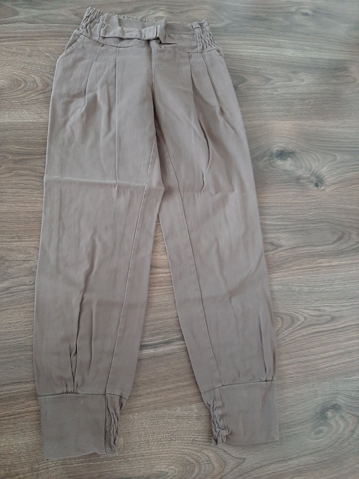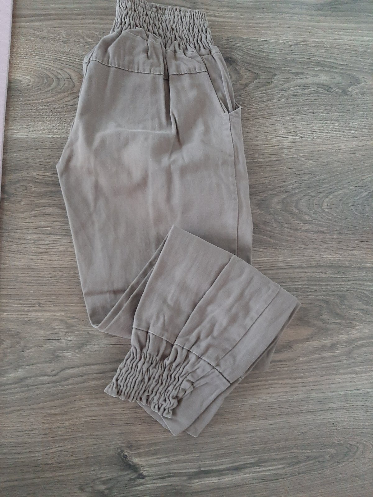 Nosené, žehlené , nohavice,šité na mieru.Stredne hrubá látka podobná ako flauš.V predu má zips.Farba svetlejšia hnedá , ako na fotkách.Taká, stredne hnedá.Pás 2x43cm,boky 2x53cm,dlž.od rozkroku 76c...