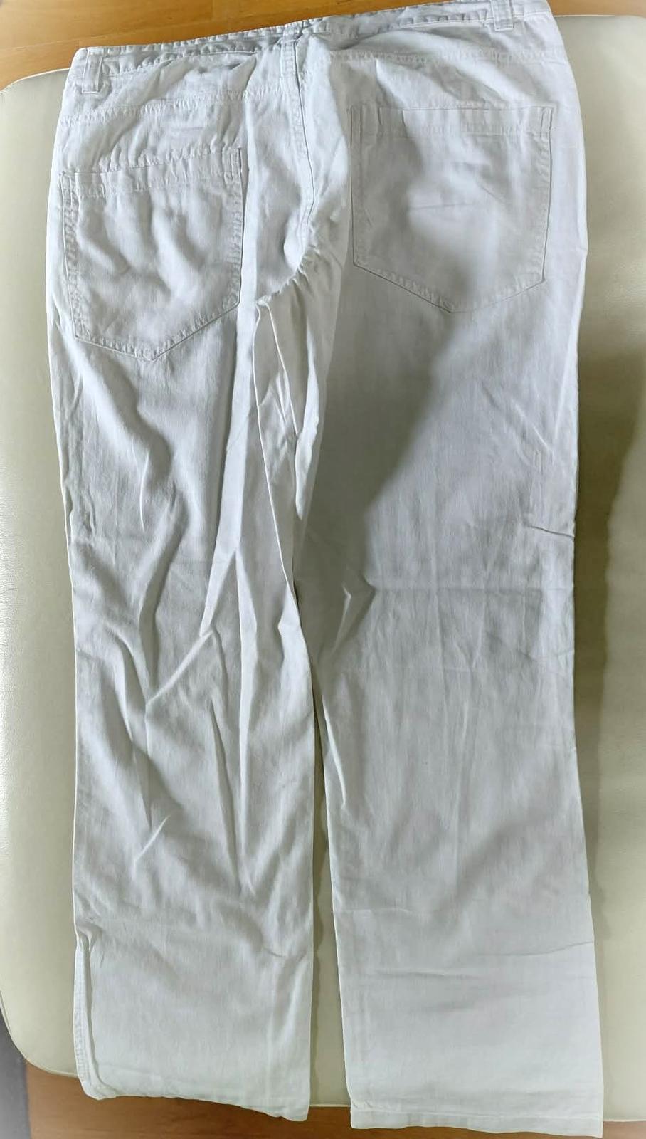 dobrý nosený stav. Na ľavom kolene pustil steh, je to zašité len ručne, treba prešiť-zohladnené v cene. Pás 2x34, dlžka od rozkroku 75, bok 100, obv. stehien 2x24. Elastické. Farba svetlunko kávová...