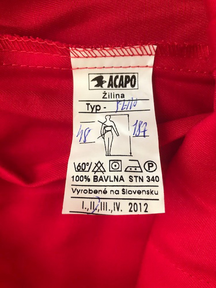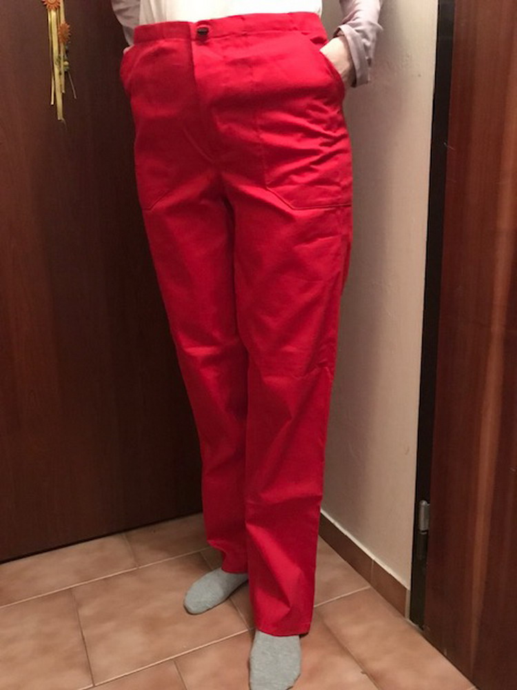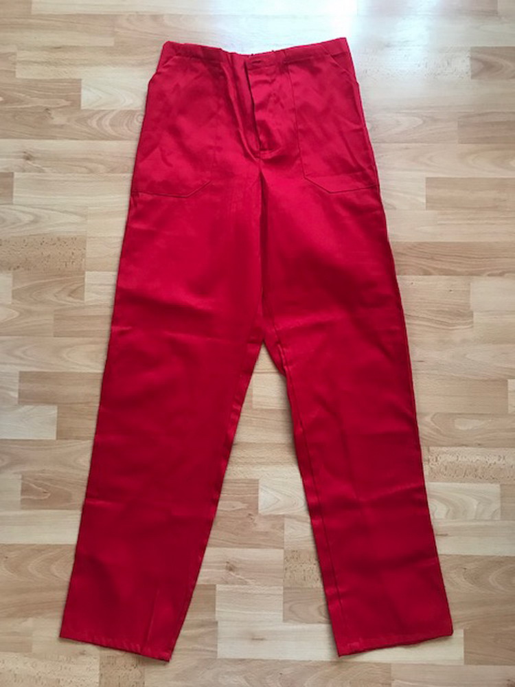 Dámske pracovné nohavice rovného strihu v červenej farbe značky Acapo, veľkosť nie je uvedená (len si tipujem M - 40/42), majú 2 predné a 1 zadné vrecko, elastický pás, zapínanie na 3 gombíky