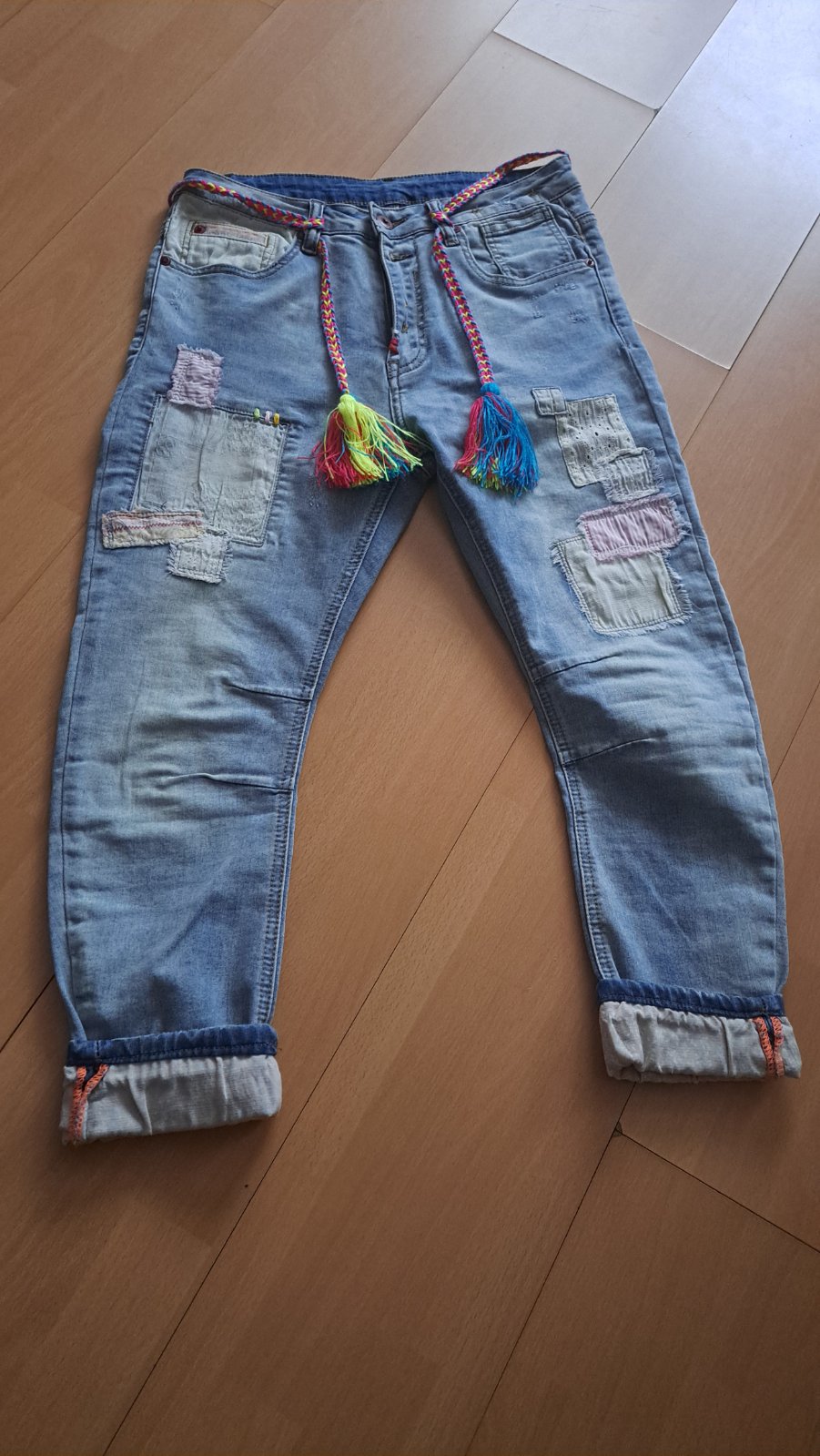 Málo nosené( asi 1x), sú mi úzke. Velkosť 29, miery: predná dlžka cca91cm, bočná dlžka cca 95 cm, vnútorná dlžka cca. 73cm, šírka (pás) : 39cm, boky:41 cm, predný sed 29cm, zadny sed 30cm, ale ešte...