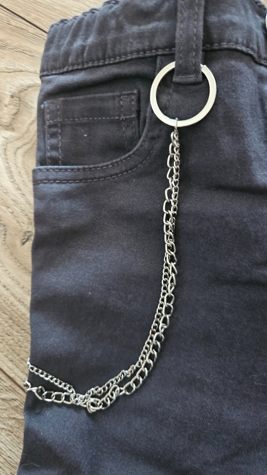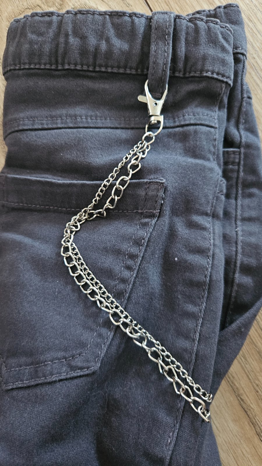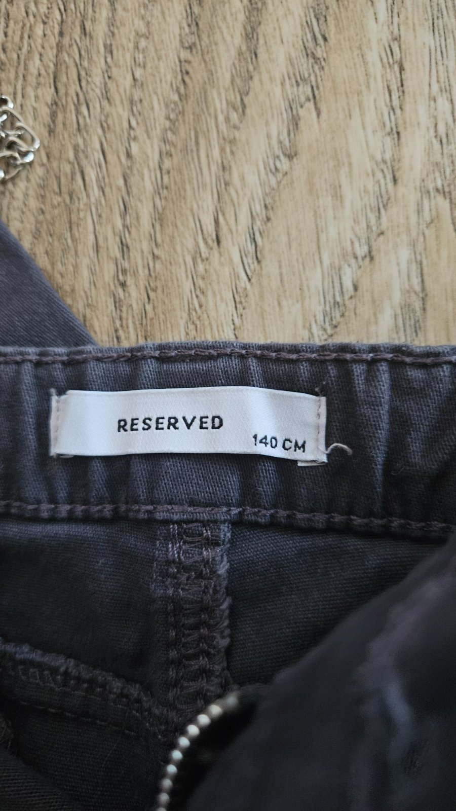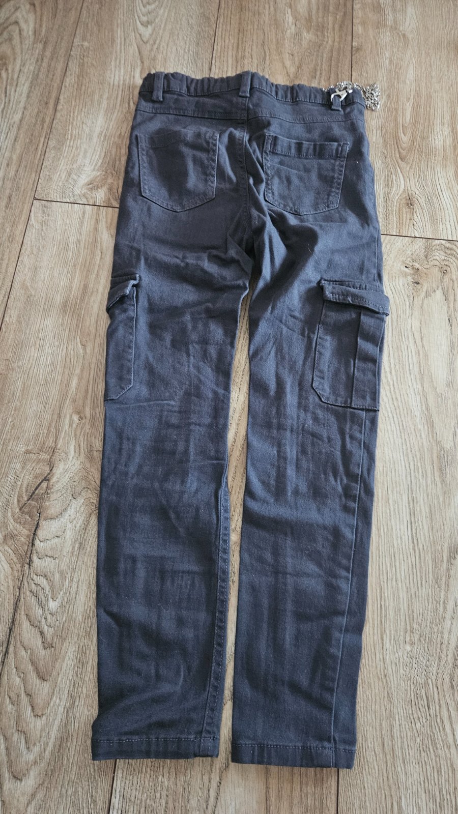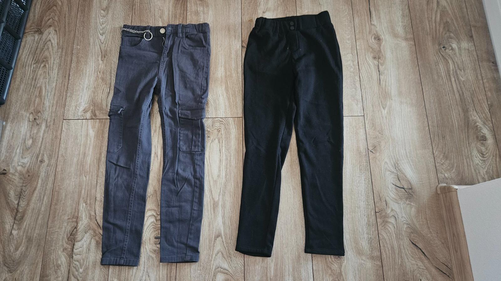 Tmavosive nohavice s bočnými vackami a retiazkou a cierne nohavice zateplene, veľkosť 140. Cena spolu 8 e.