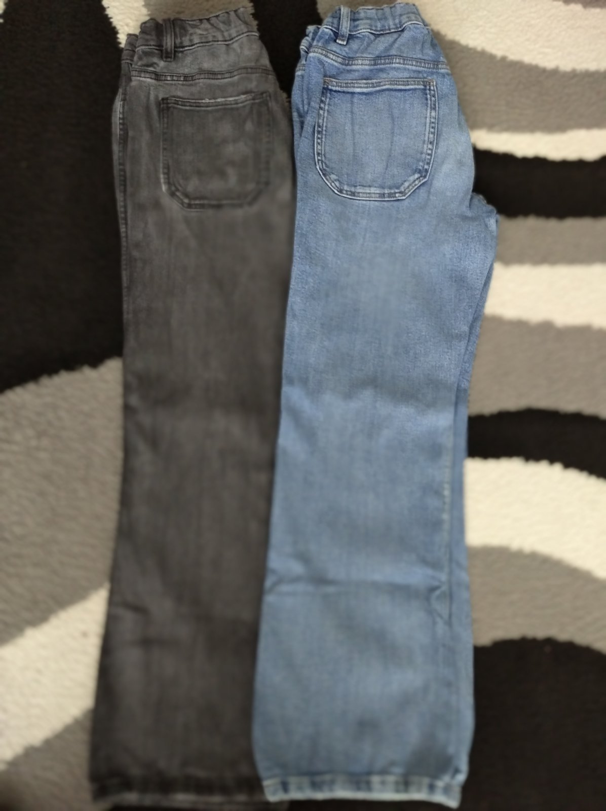Predám tieto dvoje rifle. Sú v bežnom nosenom stave. Bavlna a elastan. Cena je spolu za oboje rifle. Materiál bavlna a elastan. Rozmery modrých riflí: dĺžka 90 cm, dĺžka od rozkroku dole 70 cm, dĺžka predného dielu od pása ku rozkroku 25 cm, dĺžka zadného dielu od pása dole 29,5 cm. Šírka v páse 33 cm x 2 plus je tam guma a gombík na prispôsobenie. Rozmery šedých rifiel je : 90 cm, dĺžka od rozkroku dole 69 cm, dĺžka predného dielu od pása dole k rozkroku 25,5 cm, dĺžka zadného dielu od pása dole k rozkroku 30 cm. Šírka v páse je 34 cm plus je tam guma a gombík na prispôsobenie. Plus poštovné.