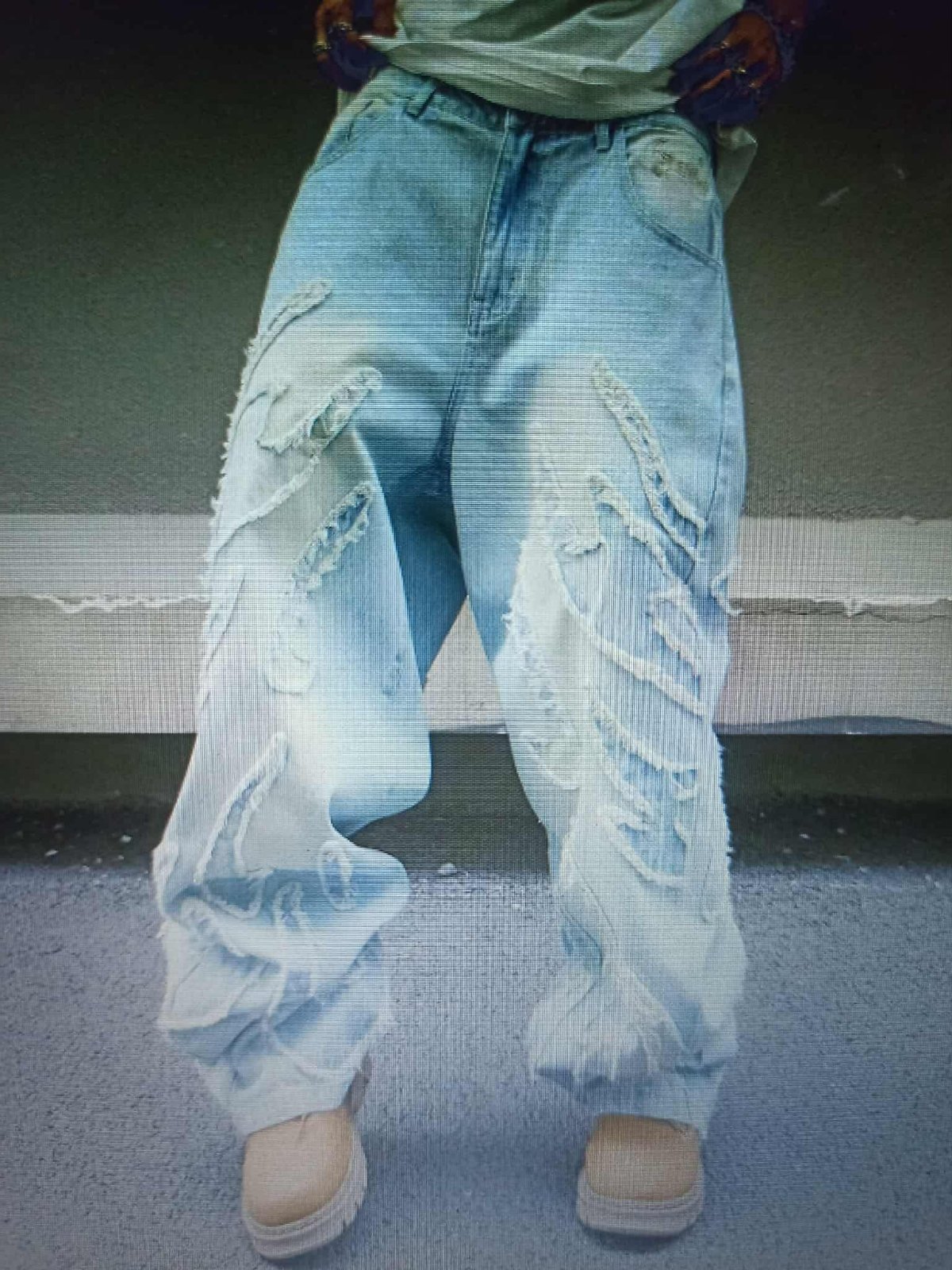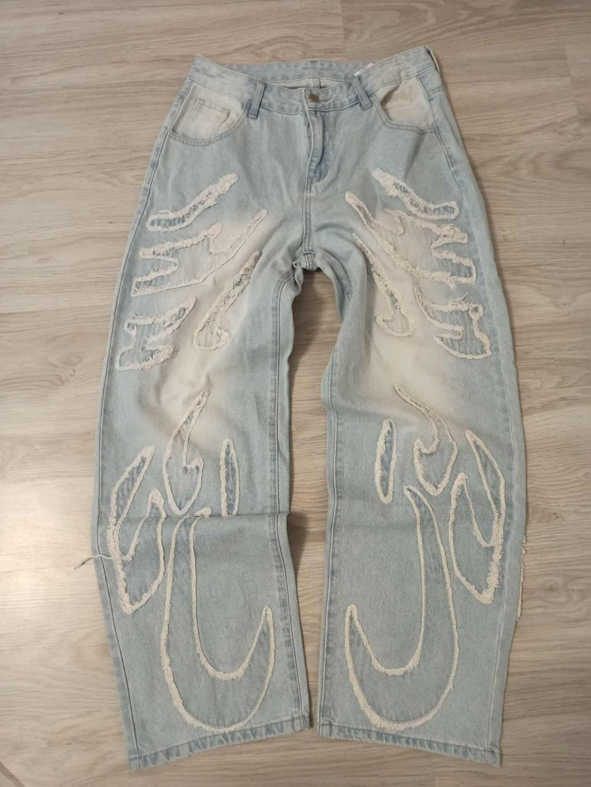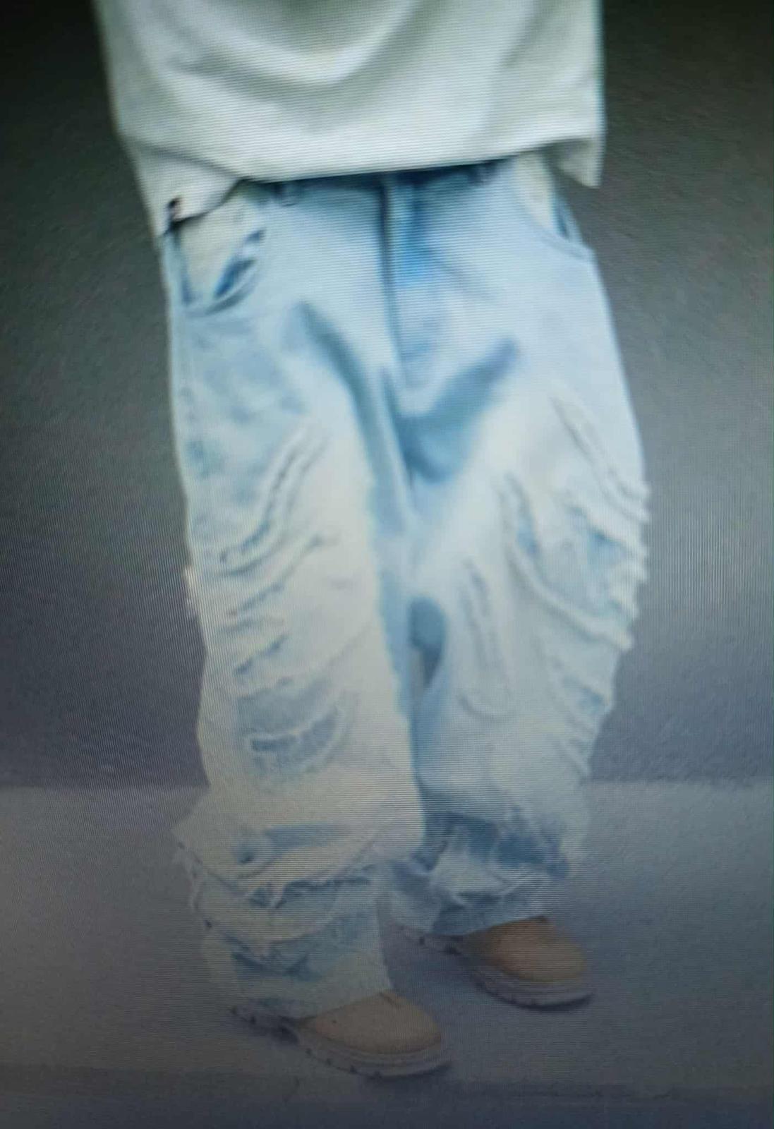 Pánske/chlapčenské ležérne džínsové nohavice voľného strihu s neopracovaným lemom a našitými vreckami, obyčajné dlhé prané vrecovité svetlomodré cargo džínsy..Rozmery: pás 82cm,boky 113cm,stehno 71,8cm,vnutorný šek 80,2cm.Na výšku od 170-180cm.Synovi sú moc široké,objednal si menšie.Pôvodná cena 42€