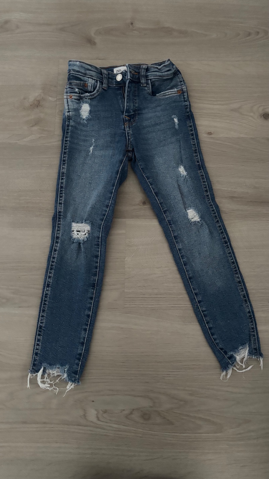 Mierne zvonove dzinsy Zara s nastavitelnym pasom, sedia na 116-122, rozmery na foto
