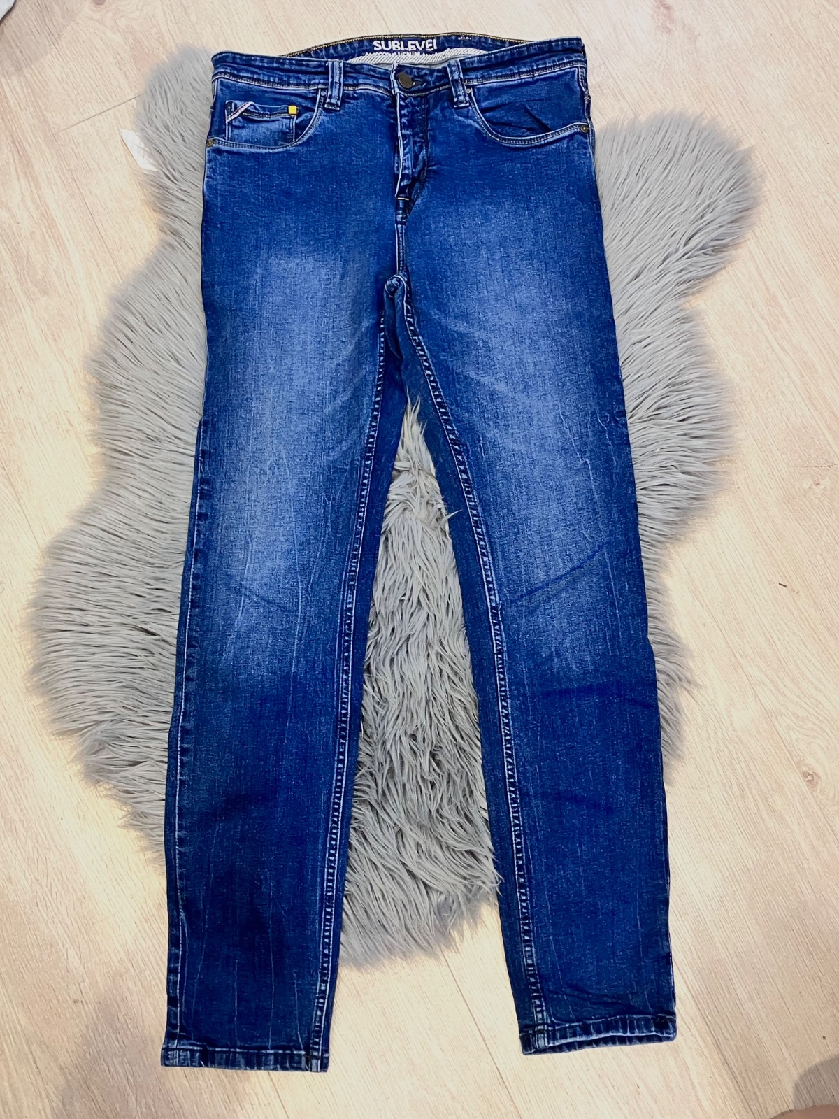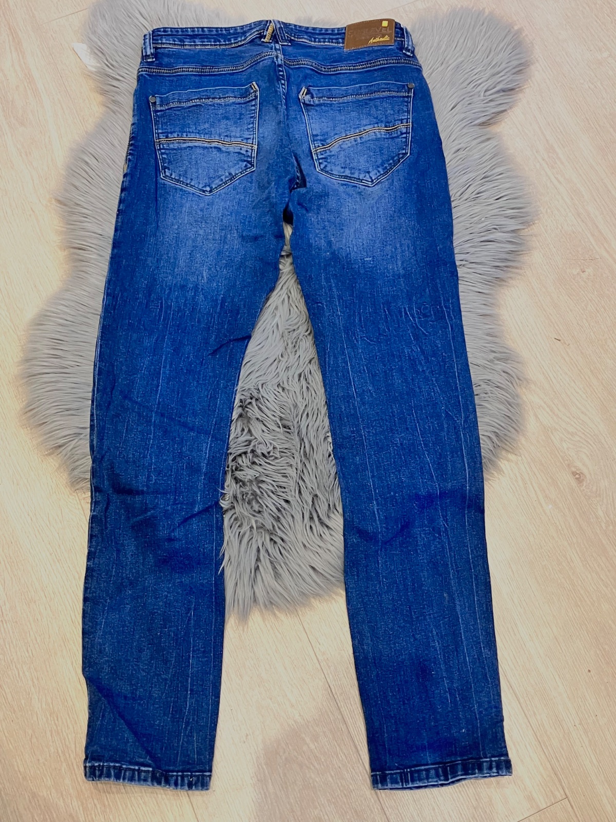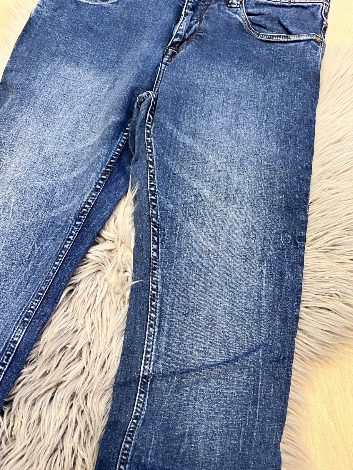 Pánske džínsy, jemne elastické, dve predné a dve zadné vrecká, pútka na opasok, zapínanie na gombík a na zips. Materiál 99%bavlna 1%elastan.