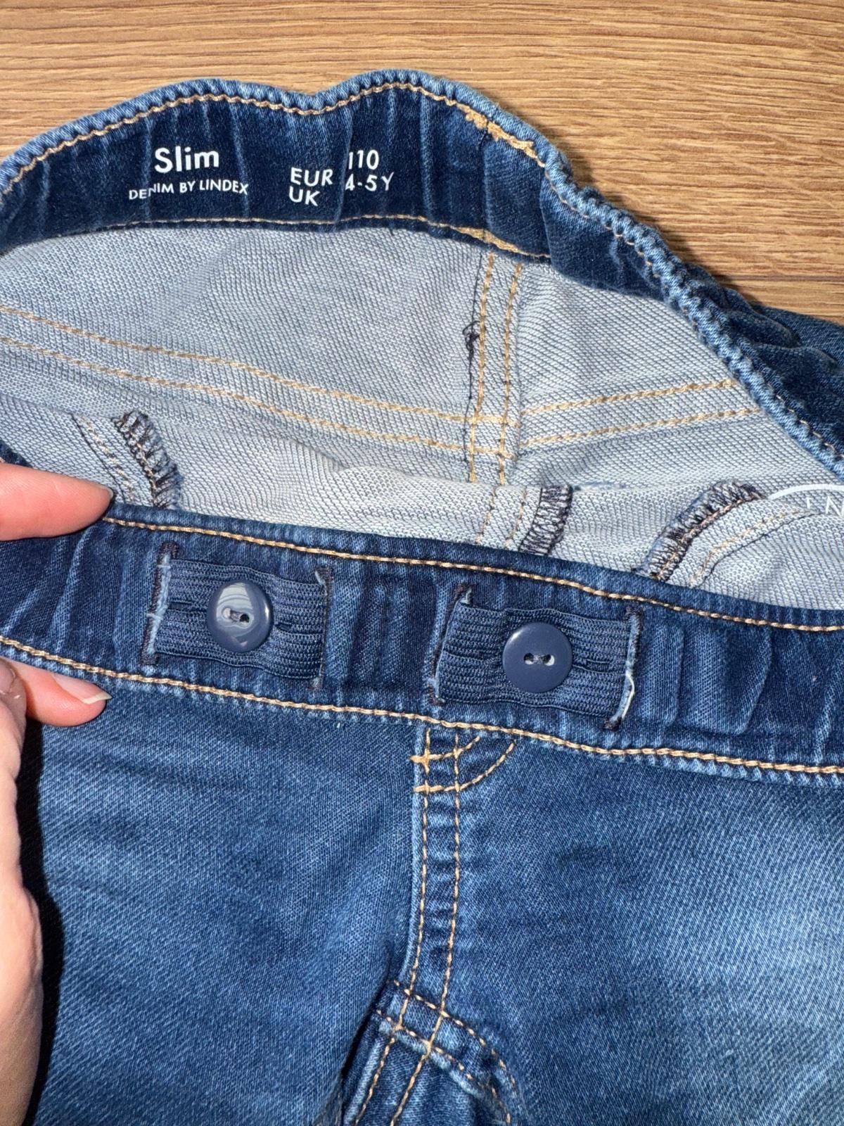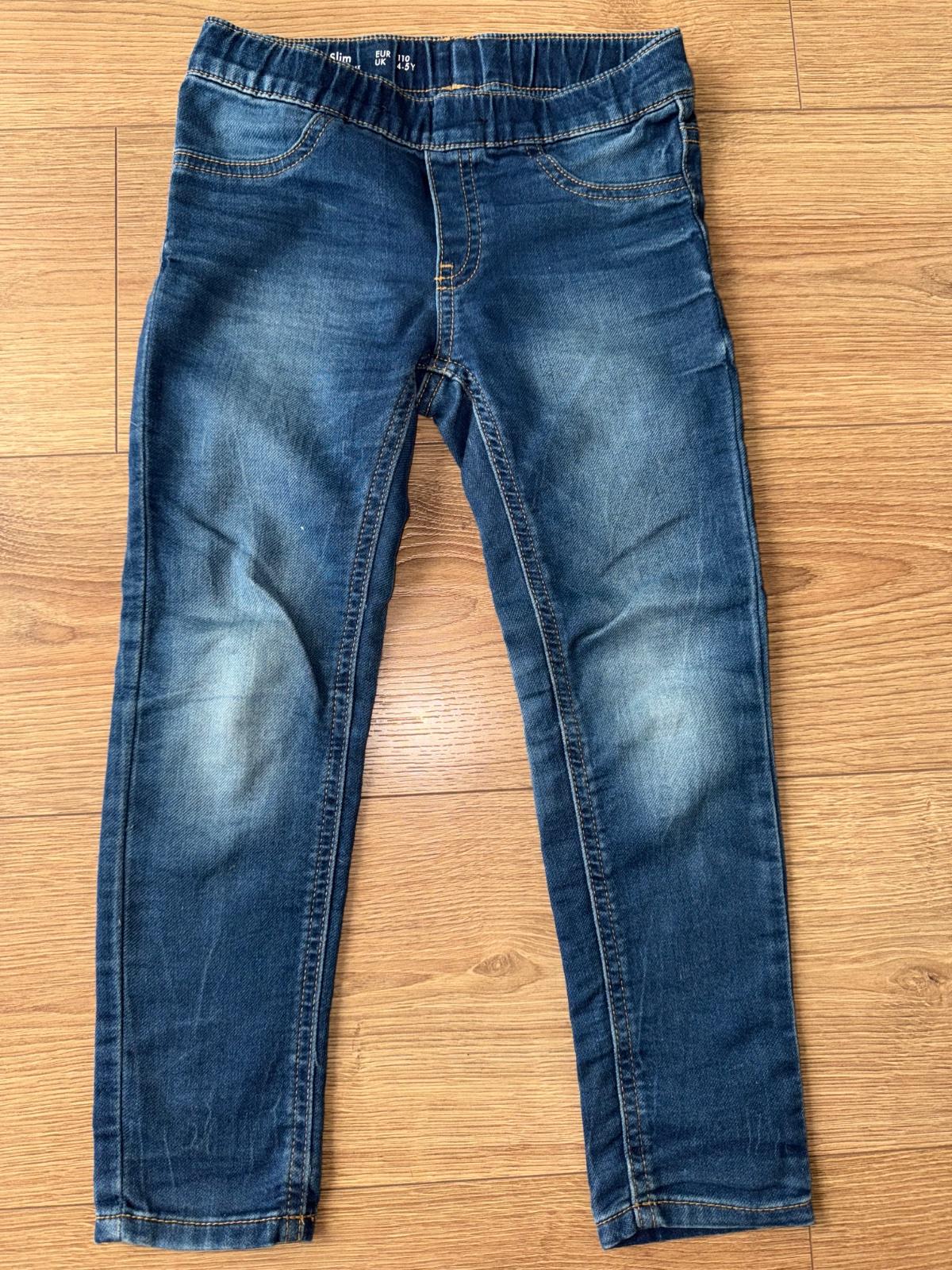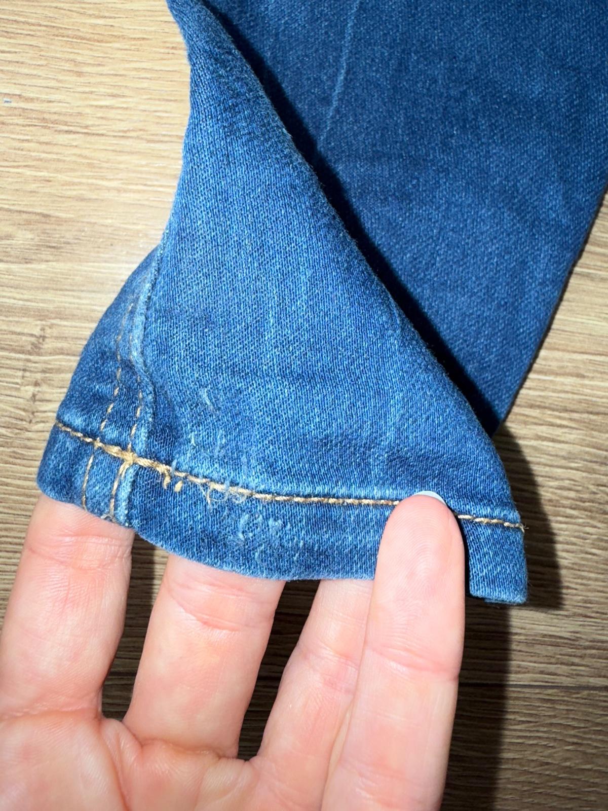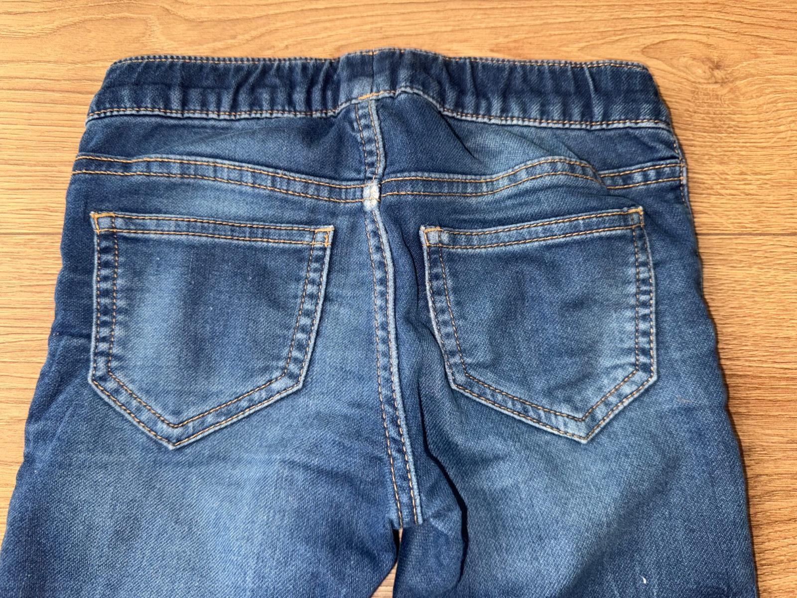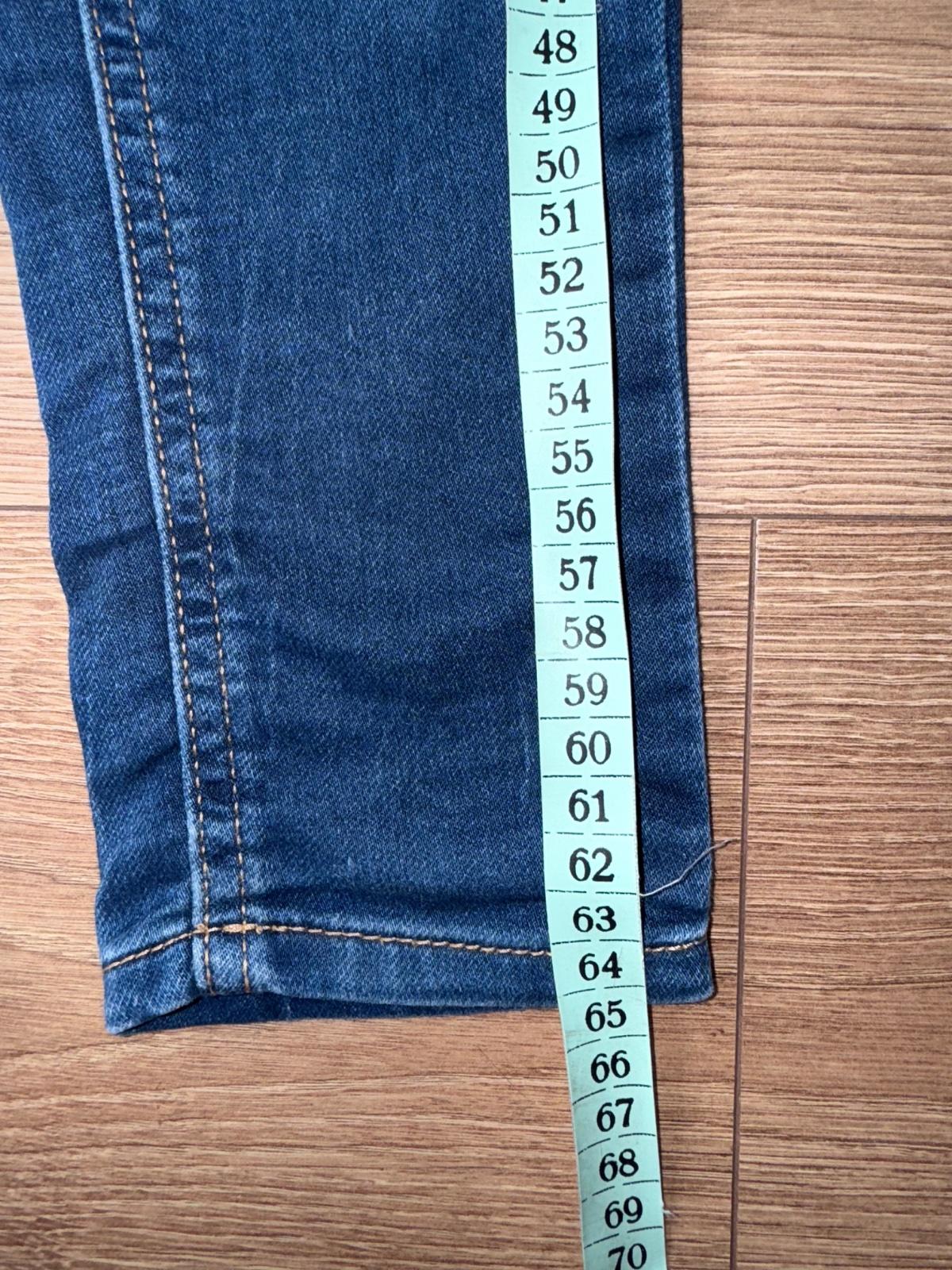 Makkučký materiál s regulaciou v páse, nie tvrda riflovina, pohodlné, lahko obliekateľne, jedna chybička - kuk všetky fotky - na jednej nohe dole akoby šuchnutie - nič strašne , inak vo veľmi peknom nosenom stave