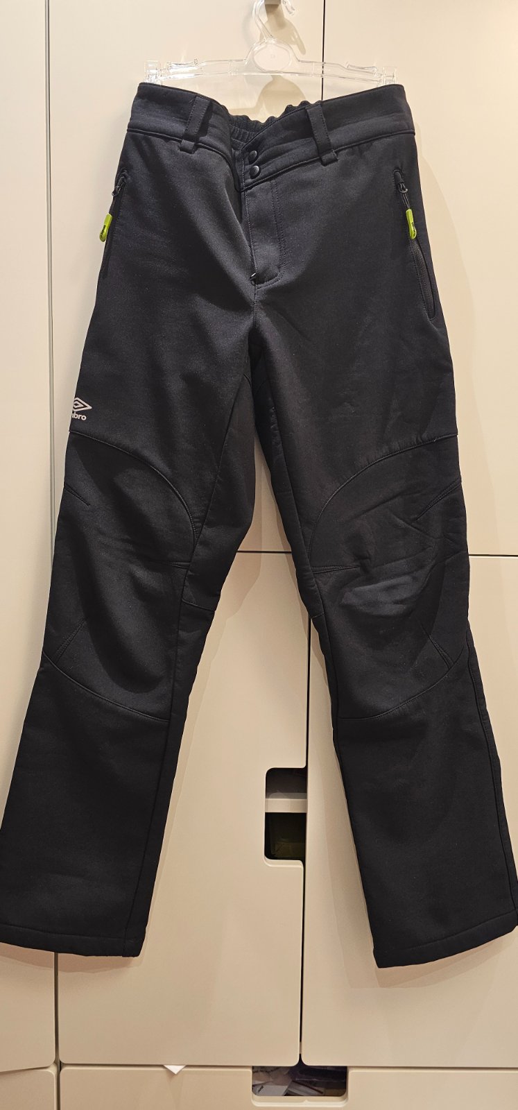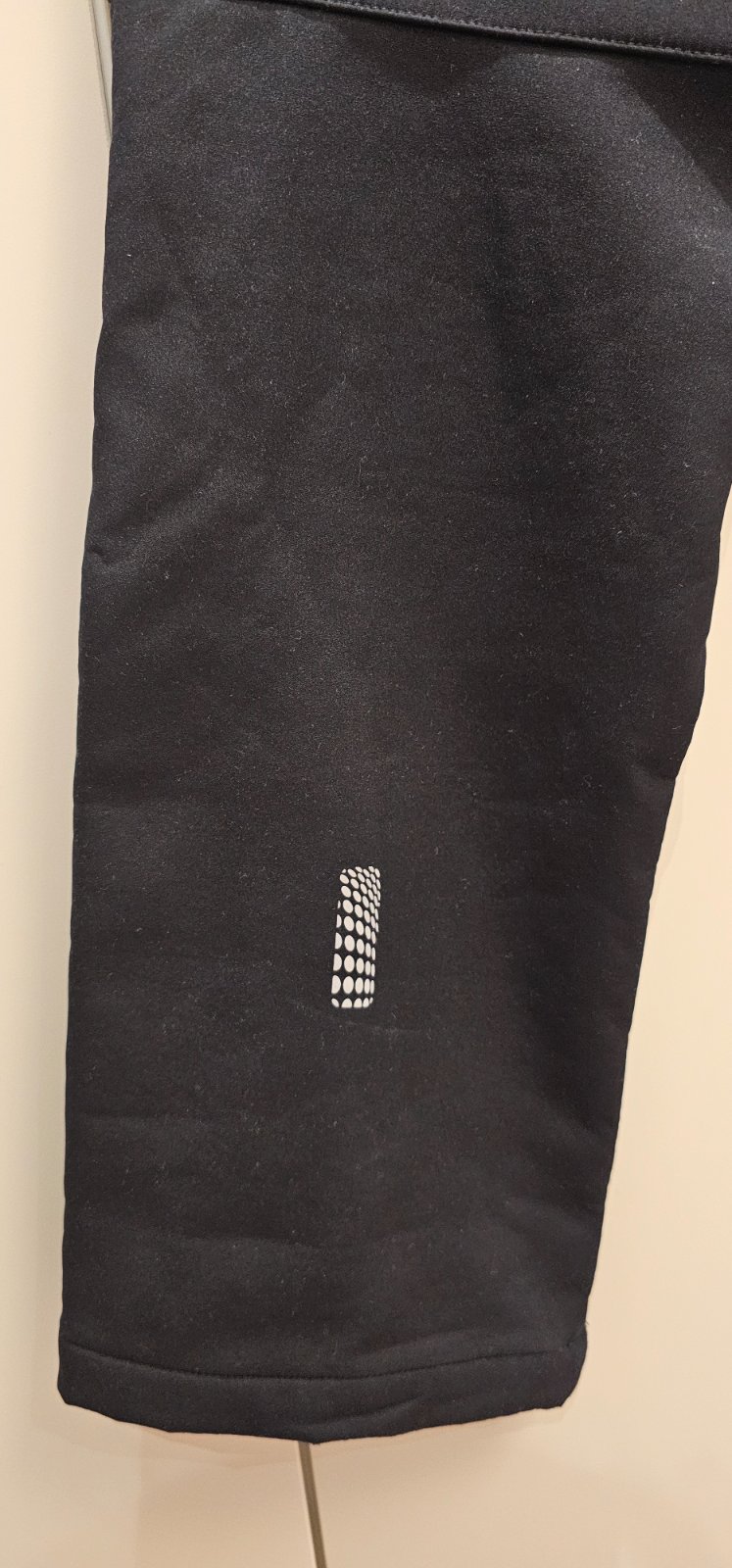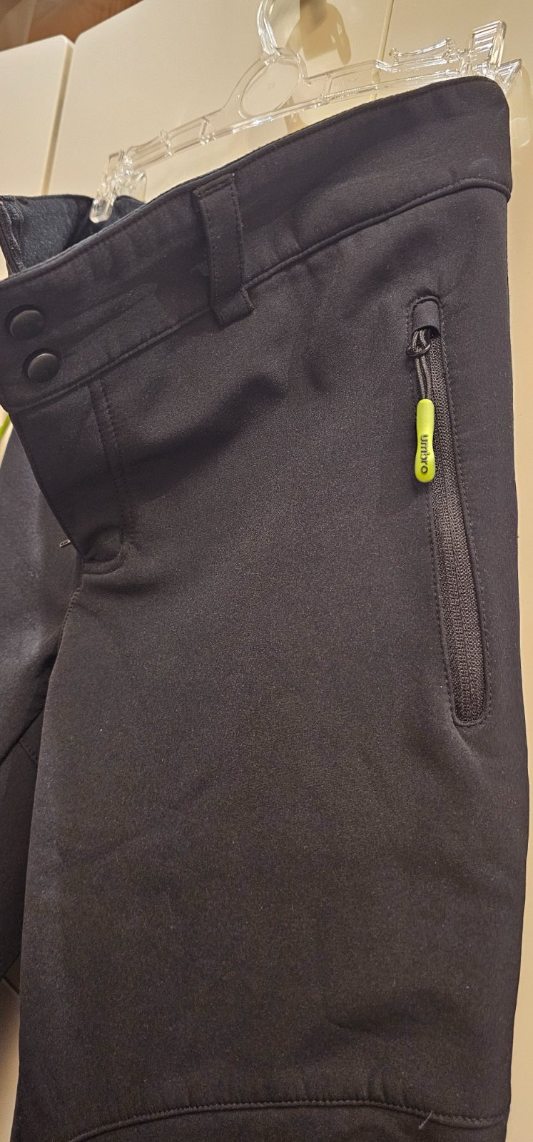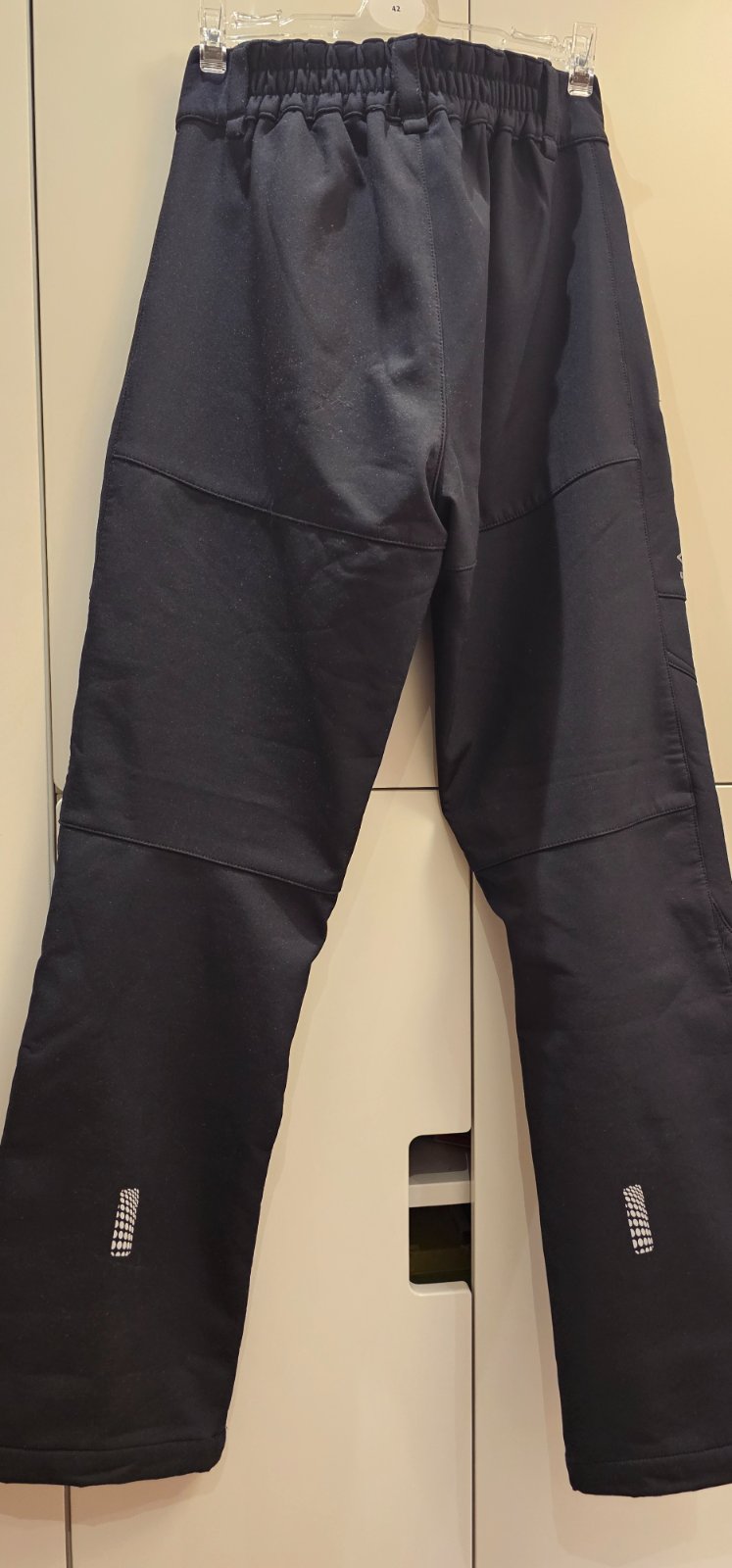Softšelové zateplené nohavice, na zimu. Kvalitné, hrubšie a nepremokavé, v páse na gumu, dvoma vreckami na zips, v sýtej čiernej farbe. Vhodné ako tepľovačky do snehu, na korčuľovanie alebo do chladného počasia. Po jednom dieťati, bez poškodenia.