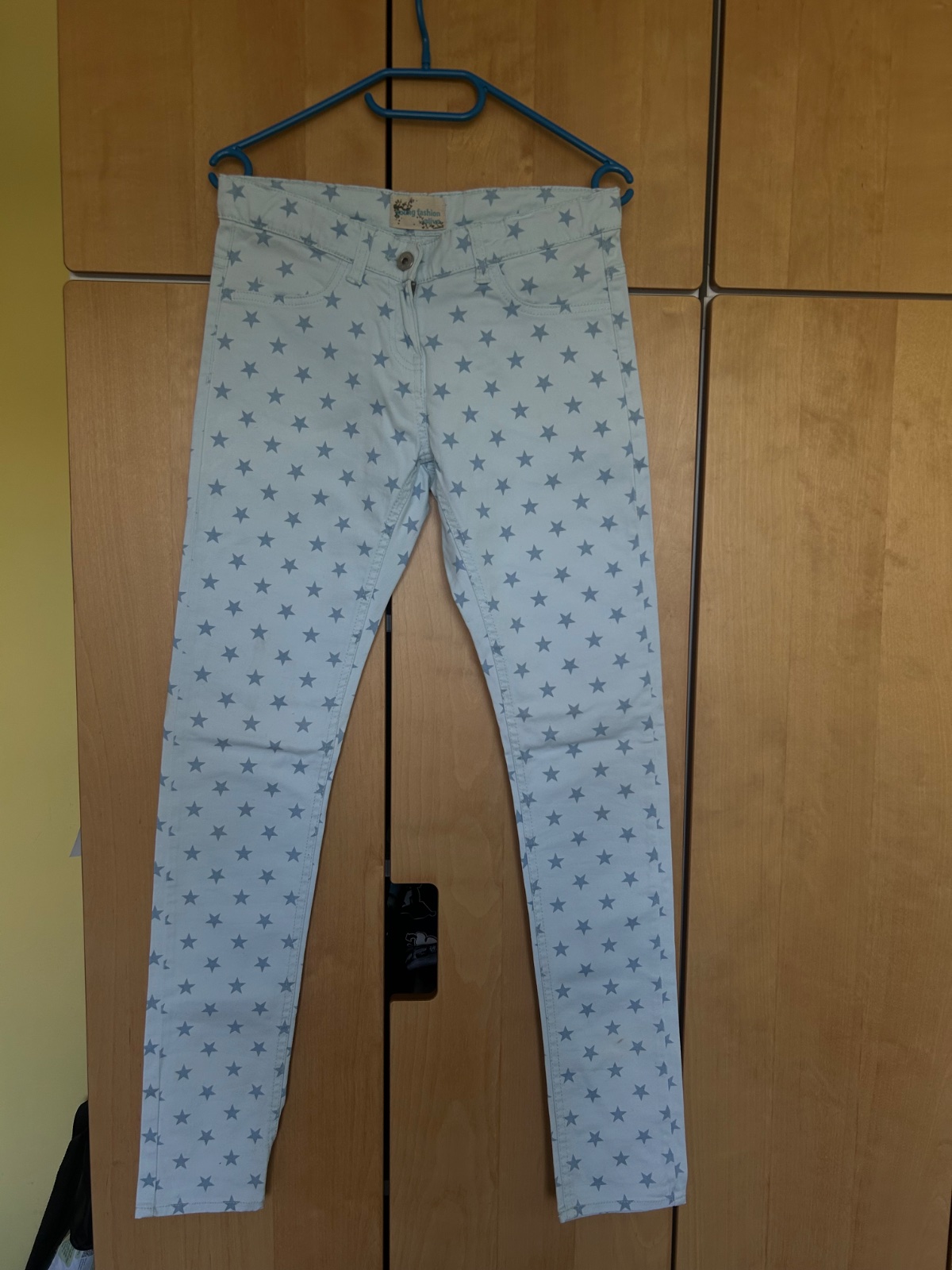 Predám pekné moderné rifle rovného strihu, s celoplošnou potlačou, nastaviteľný pás, malinko nosené, v top stave