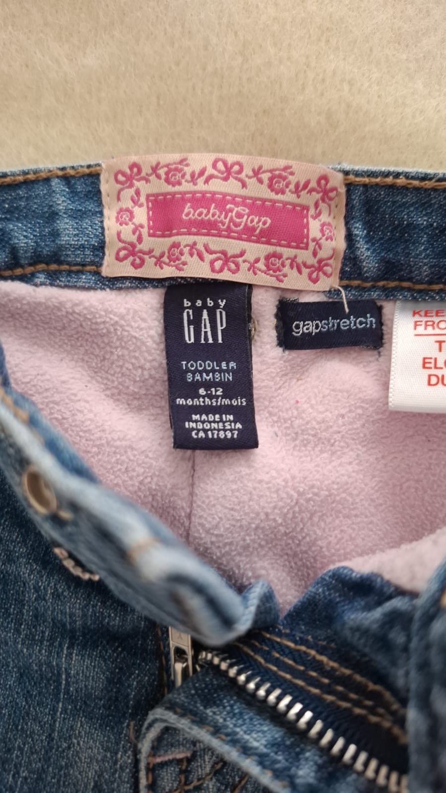 Detské zateplené dievčenské rifle značky GAP. Veľkosť 6-12 mesiacov.