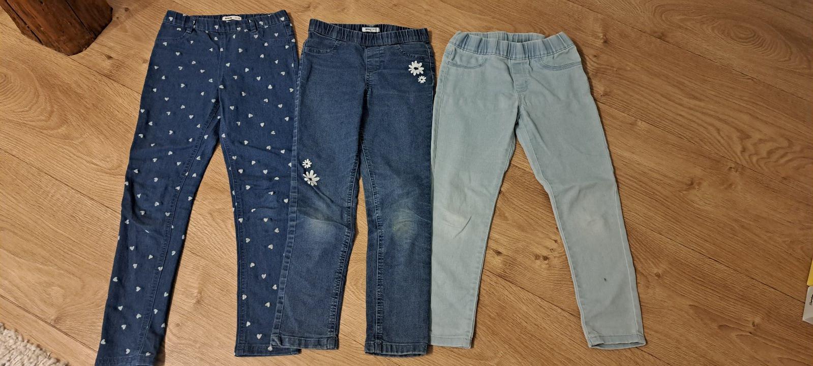 Rifle po jednom dieťati. Prvé dve sinsay, bez poškodenia. Bledomodré značka bez značky, fliačk na ľavej nohe dole,vzadu pri vrecku jemne pofŕkané- tieto DARUJEM. Rifle sú bez regulácie pásu, bez gombíka.