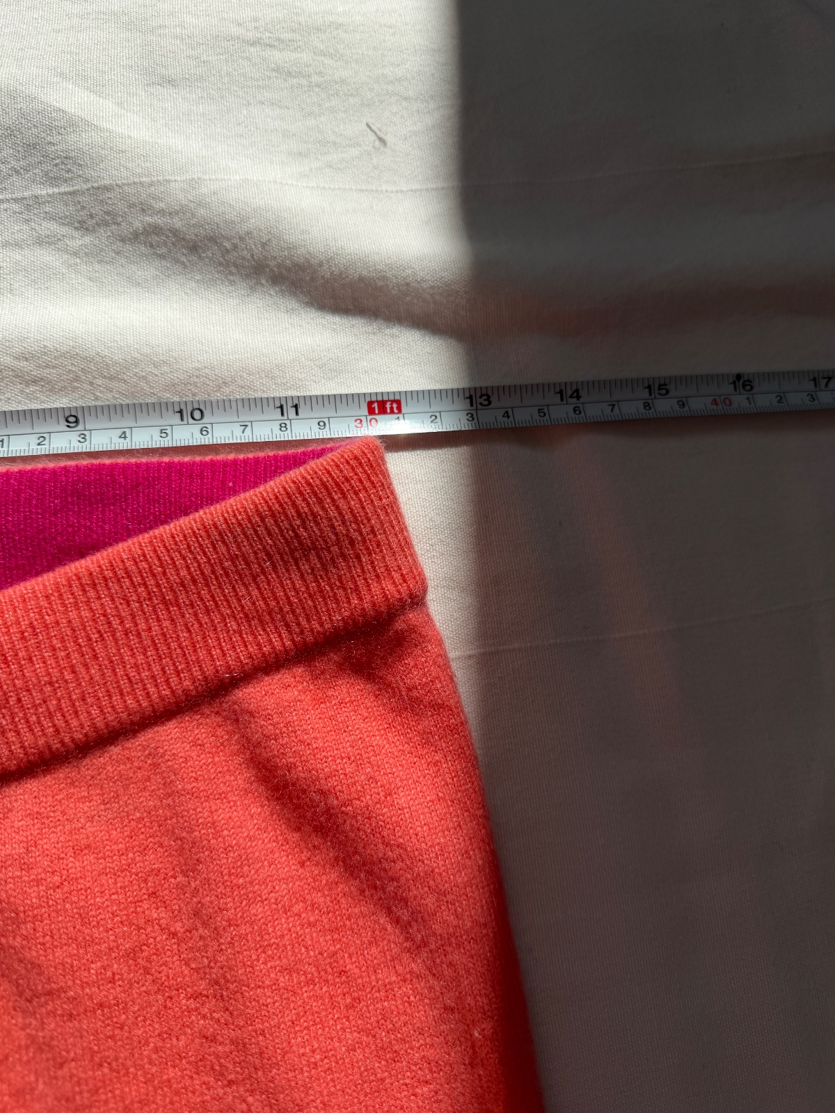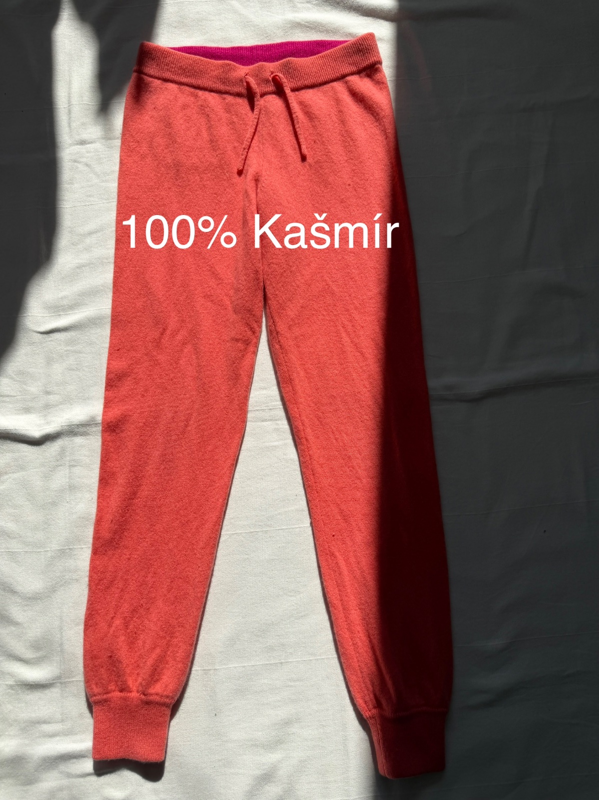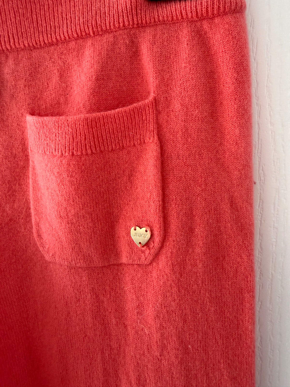 Krásne, neuveriteľne mäkké tepláky od ikonickej značky Juicy Couture. Tento špičkový produkt je vyrobený zo 100 % vysoko kvalitného kašmíru, ktorý zaručuje neuveriteľné pohodlie, teplo a hebkosť na pokožke. Farba je energická koralová/lososovo ružová s kontrastným fuchsiovým lemom na vnútornej strane pásu. Na zadnej strane sú dve vrecká, z ktorých jedno má očarujúci zlatý prívesok v tvare srdca s nápisom „Juicy“. Tieto klasické tepláky majú manžety na nohaviciach, elastický pás a nastaviteľnú šnúrku. Veľkosť na štítku: US 12 s dodatkom CH 155/63 označuje detskú/mládežnícku veľkosť (pre výšku približne 155 cm).