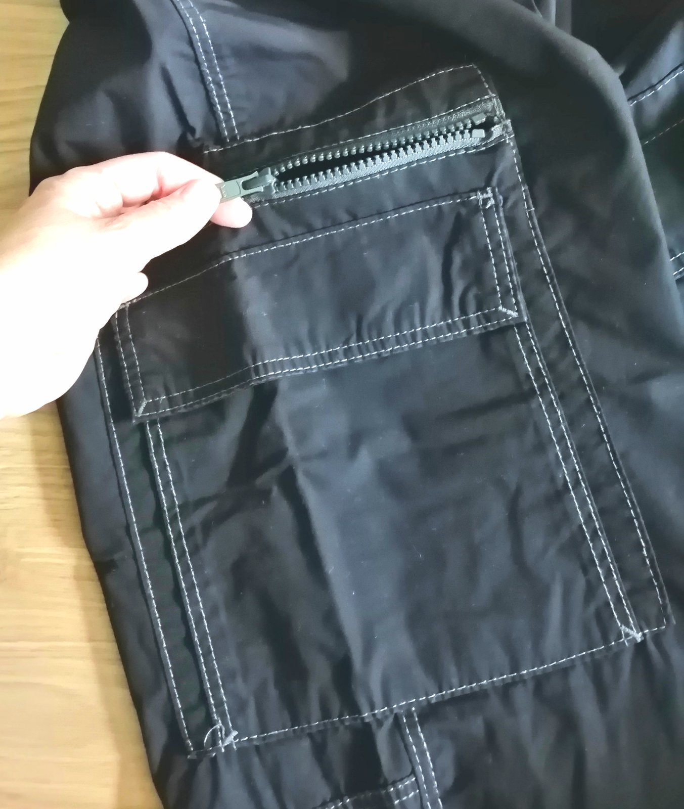 Kvalitné bavlnené chlapčenské cargo nohavice v čiernej farbe s bielym štepovanim, tenšie, ba teplejšie dní, v páse širšia guma a funkčná šnúrka, dve funkčné bočné vrecká a na nohách dve vrecká, jedno na zips. Dolu okolo nôh gumičky.