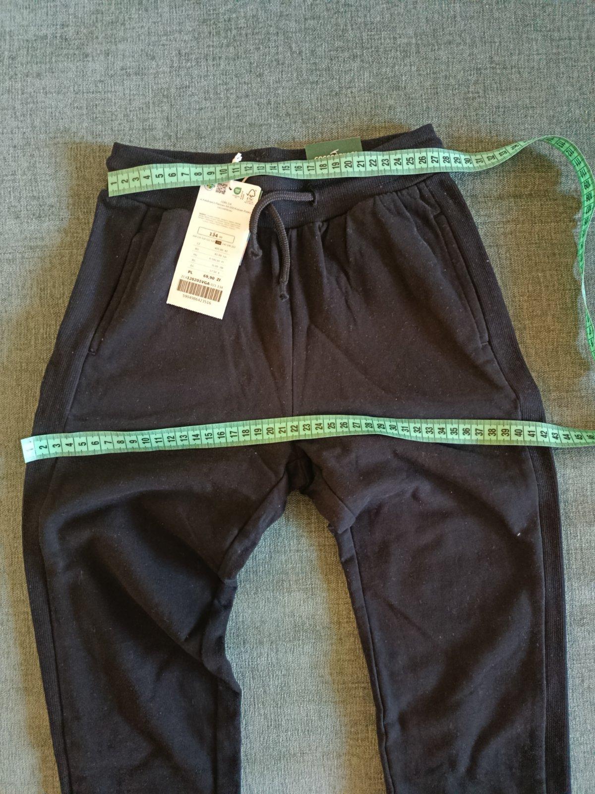 Nové bavlnené tepláky na štíhlu postavu. V páse guma a šnúrka, bočné vrecká. Veľkosť uvedená 134, myslím že nositeľné aj skôr ako 128. Miery na fotkách.