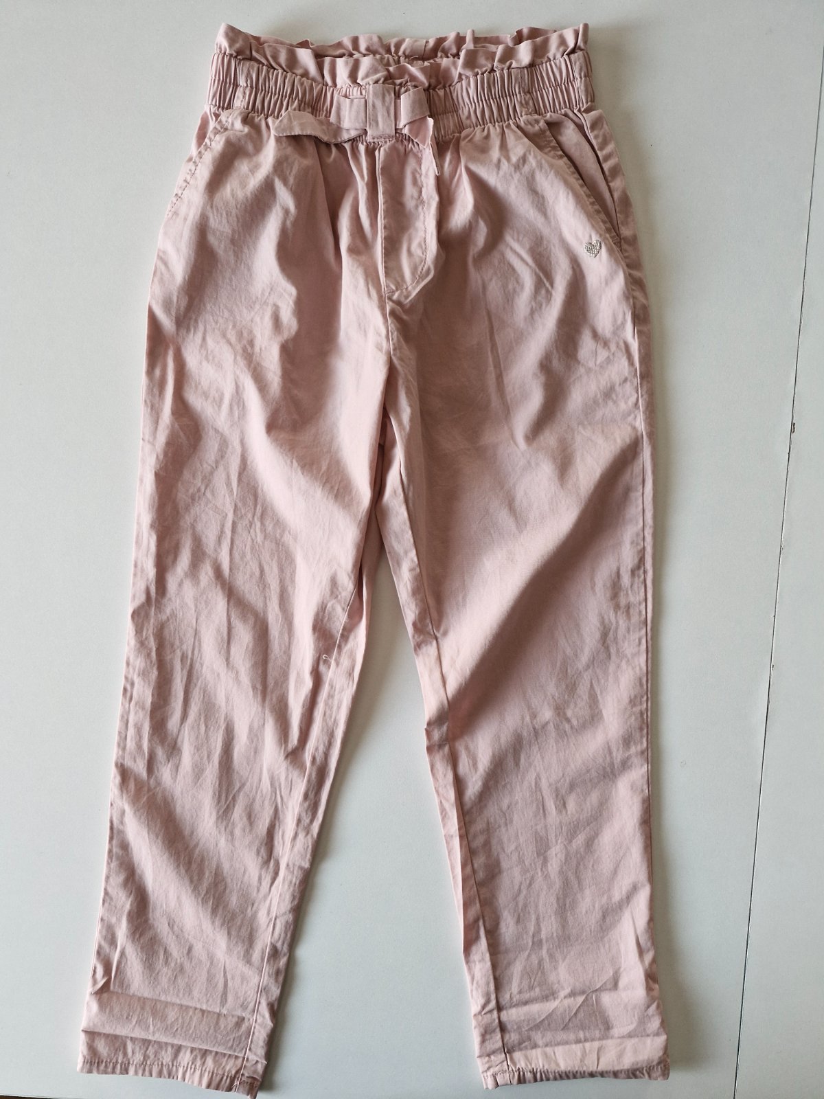 Krásne rifličky z jemnej rifloviny na 7-8 rokov. Zapibanie na zips,gombík, v pase nastavitelna guma, funkcné vrecka vpredu v tvare srdiečka, i vzadu. Dlzka 77,5cm, pas 30cm vklude.