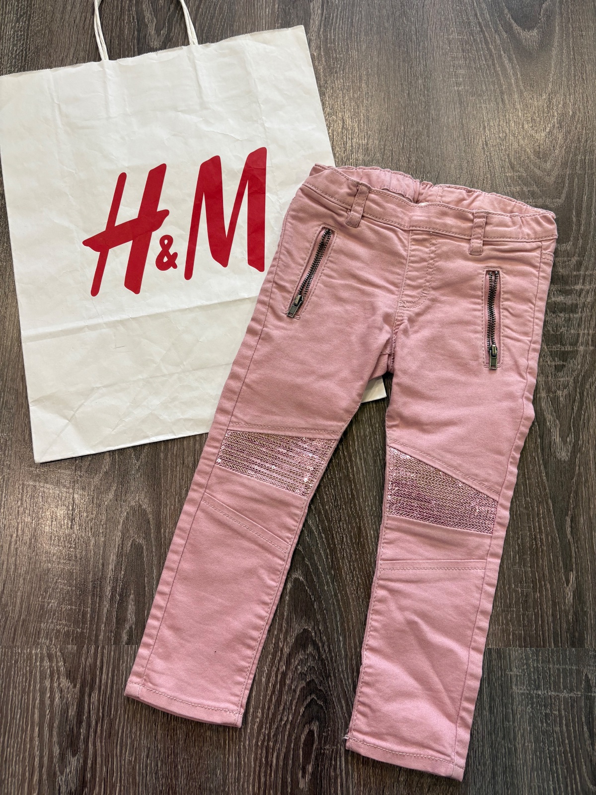 03.H&M krasne dievcenske elasticke skinny rifle s trblietkami vo velkosti 92,dlzka je 49cm a sirka v pase je od 25x2cm do 29x2cm,v pase je gumka a stahovacia gumka