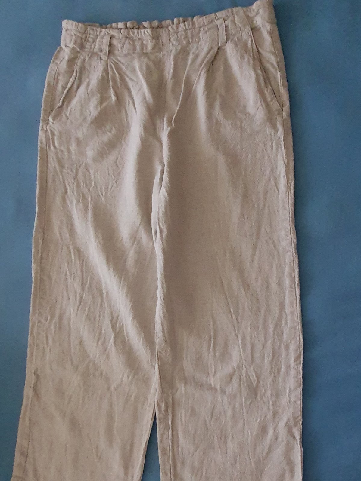 Ľanové letné široké nohavice. Kúpila som dcére, nechce ich nosiť. Sú len oprané, už bez visačky. Klasická farba režného plátna. Rovný strih. Značka Ever.me. Veľkosť písaná S, dcéra nosí aj M a 168-170.