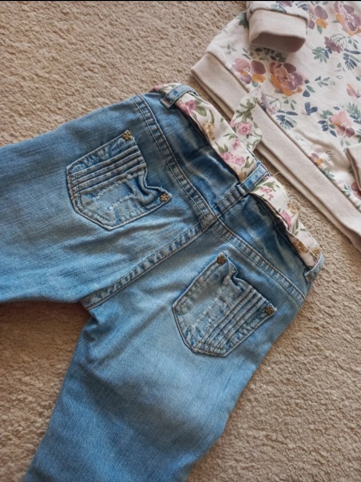 Krásne rifličky ZARAbaby veľ.86. Štýlovky. Vnútorná dĺžka nohavice 33cm. Kvetinový krásny opasok je vzadu všitý. Krásne detaily- kvietkové nity, vrecká. Regulácia pásu gumičkami. Mikina grátis so cute 92, no menšia.nositeľné spolu