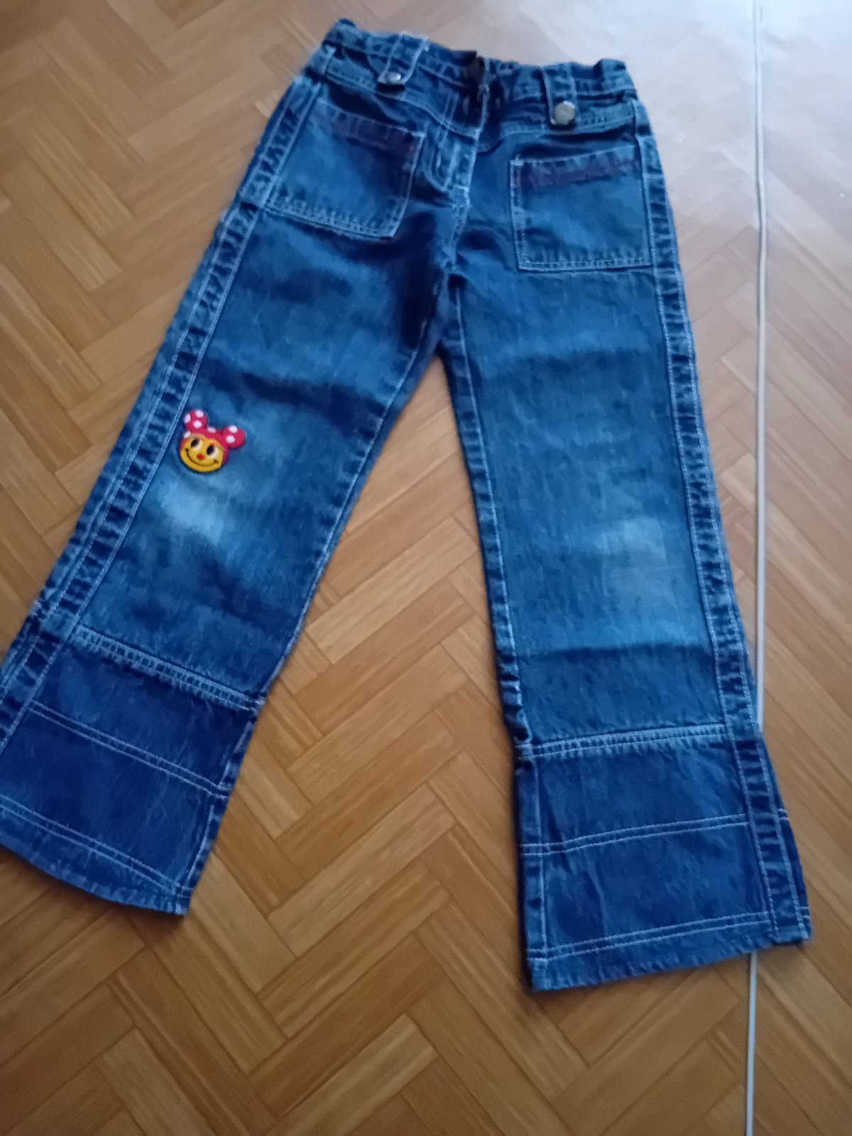 Rifle pre dievca celková dĺžka 73 cm od klinu dole 53 cm v adu je guma čiže povolia v predu pevné malý zips neposkodeny plus gombicek ešte zapnut dá sa dat aj opasok na ľavej nohe dole trochu oskrete co vôbec nevadí inak sú veľmi.i dobre