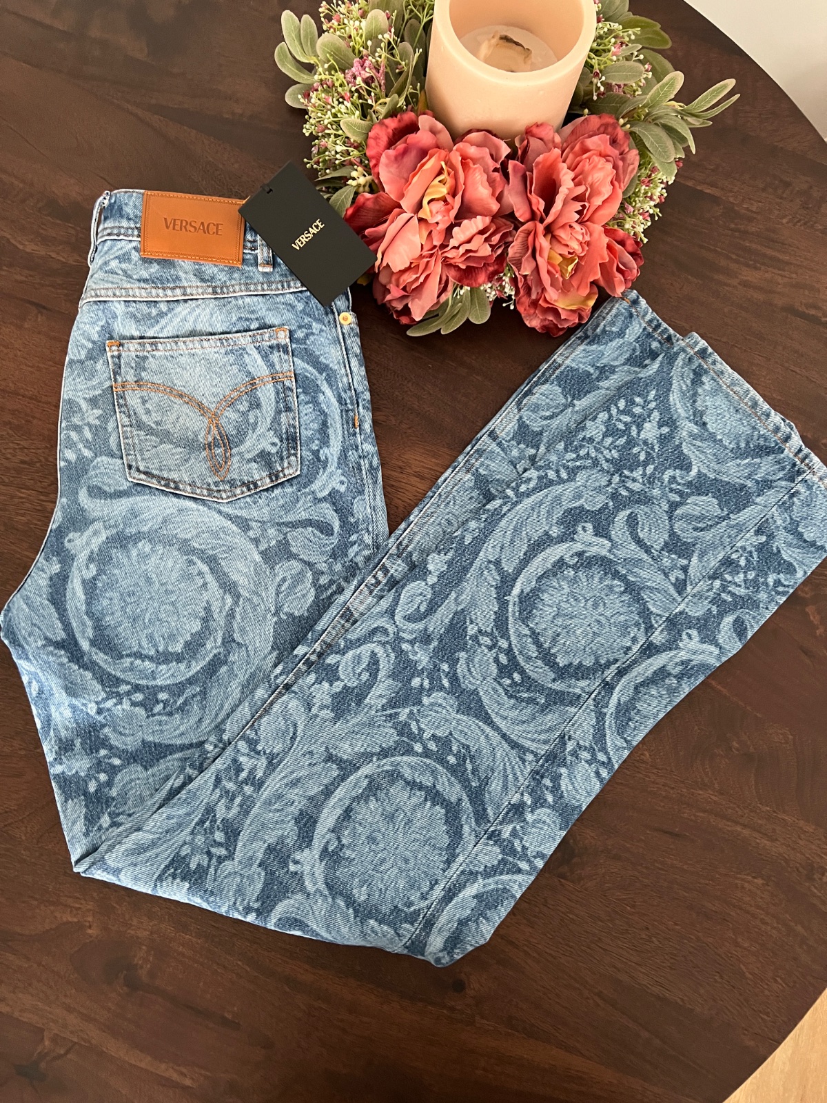 Krasne rifle Versace velkost M , kupovane na Mallorke. Stali 950€ cenu vidno na poslednej fotke . Su nove s vysackami. Predavam k nim aj bluzku Versace na fotke za 650€