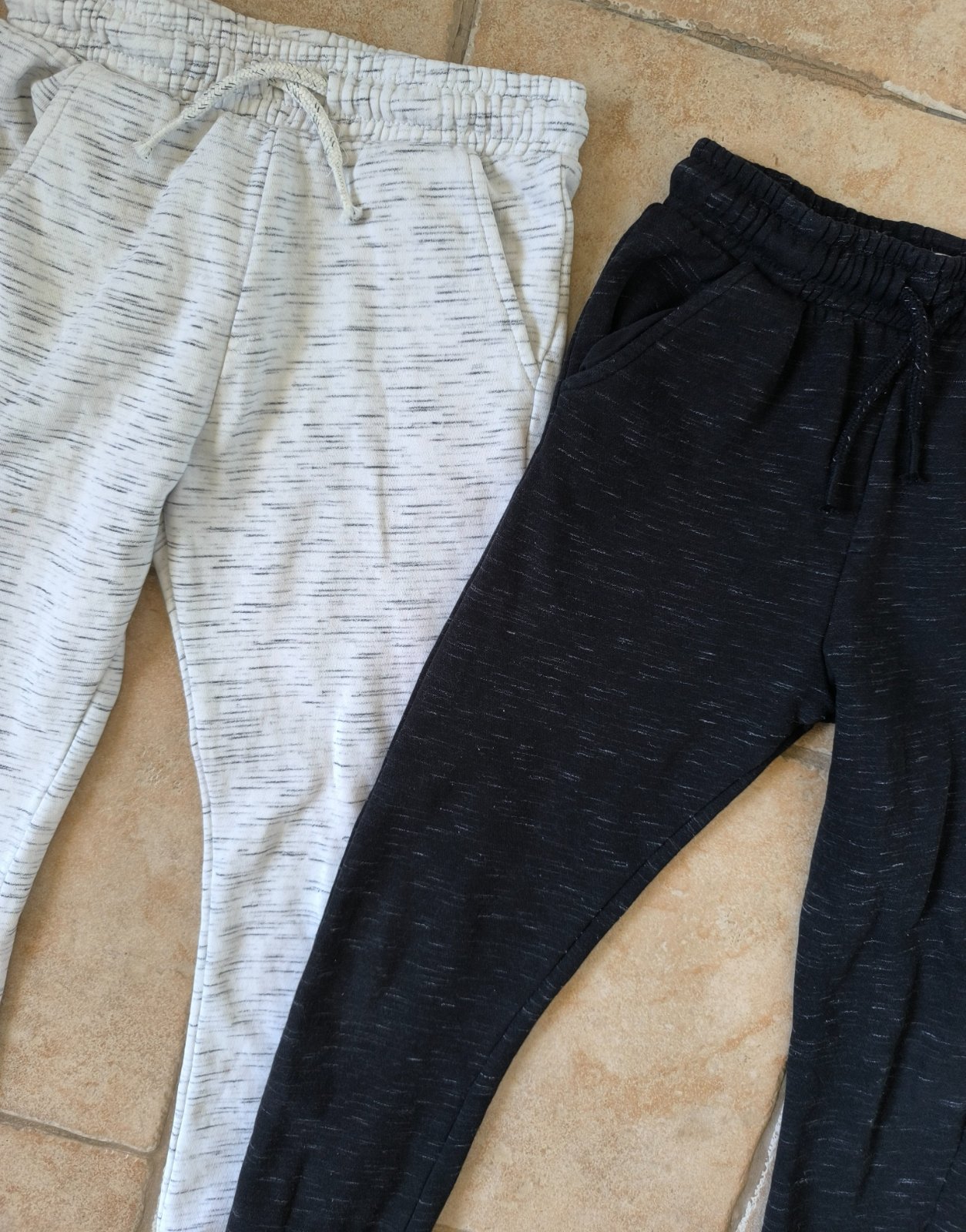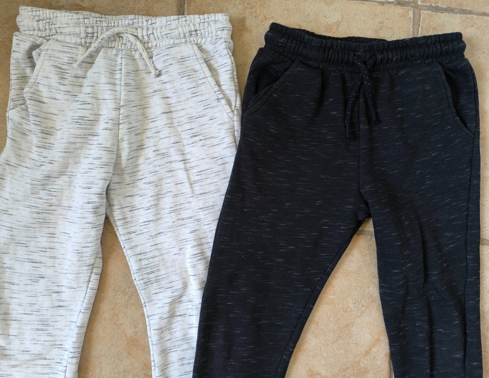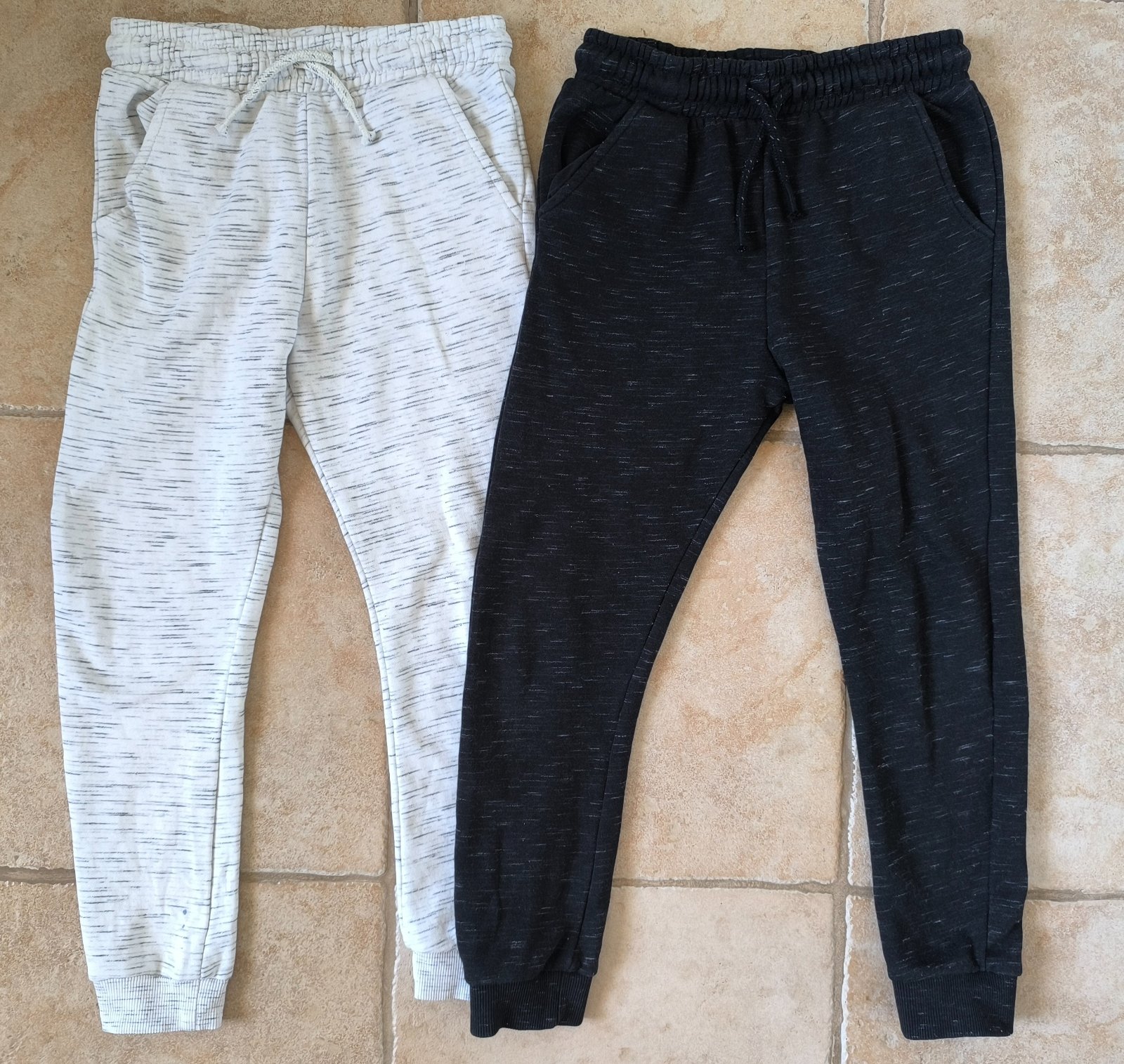 Všetky veci sú v peknom nosenom stave. Bez dier,flakov. Sive teplaky FF sú zateplené,akurát napis je trošku zošúchaný Čierno/biele teplaky Pepco-trošičku bledsia farba hlavne na páse,snurka už nie...